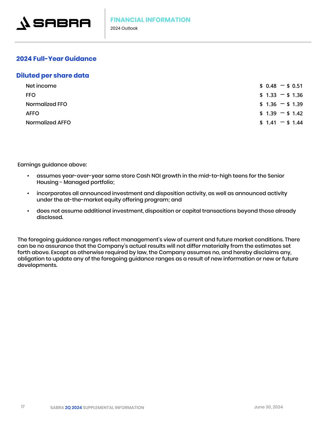 24 SABRA 2Q 2024 SUPPLEMENTAL INFORMATION June 30, 2024 APPENDIX Disclaimer Disclaimer This supplement contains “forward-looking” information as that term is defined in the Private Securities Litigation Reform Act of 1995. Any statements that do not relate to historical or current facts or matters are forward-looking statements. Examples of forward-looking statements include all statements regarding our expected future financial position (including our earnings guidance for 2024, as well as the assumptions set forth therein), results of operations, cash flows, liquidity, business strategy, growth opportunities, potential investments, and plans and objectives for future operations. You can identify some of the forward-looking statements by the use of forward-looking words such as "anticipate," "believe," "plan," "estimate," "expect," "intend," "should," "may" and other similar expressions, although not all forward-looking statements contain these identifying words. Our actual results may differ materially from those projected or contemplated by our forward-looking statements as a result of various factors, including, among others, the following: increased labor costs and historically low unemployment; increases in market interest rates and inflation; pandemics or epidemics, including COVID-19, and the related impact on our tenants, borrowers and Senior Housing - Managed communities; operational risks with respect to our Senior Housing - Managed communities; competitive conditions in our industry; the loss of key management personnel; uninsured or underinsured losses affecting our properties; potential impairment charges and adjustments related to the accounting of our assets; the potential variability of our reported rental and related revenues as a result of Accounting Standards Update (“ASU”) 2016-02, Leases, as amended by subsequent ASUs; risks associated with our investment in our unconsolidated joint ventures; catastrophic weather and other natural or man-made disasters, the effects of climate change on our properties and a failure to implement sustainable and energy-efficient measures; increased operating costs and competition for our tenants, borrowers and Senior Housing - Managed communities; increased healthcare regulation and enforcement; our tenants’ dependency on reimbursement from governmental and other third-party payor programs; the effect of our tenants, operators or borrowers declaring bankruptcy or becoming insolvent; our ability to find replacement tenants and the impact of unforeseen costs in acquiring new properties; the impact of litigation and rising insurance costs on the business of our tenants; the impact of required regulatory approvals of transfers of healthcare properties; environmental compliance costs and liabilities associated with real estate properties we own; our tenants’, borrowers' or operators’ failure to adhere to applicable privacy and data security laws, or a material breach of our or our tenants’, borrowers' or operators’ information technology; our concentration in the healthcare property sector, particularly in skilled nursing/transitional care facilities and senior housing communities, which makes our profitability more vulnerable to a downturn in a specific sector than if we were investing in multiple industries; the significant amount of and our ability to service our indebtedness; covenants in our debt agreements that may restrict our ability to pay dividends, make investments, incur additional indebtedness and refinance indebtedness on favorable terms; adverse changes in our credit ratings; our ability to make dividend distributions at expected levels; our ability to raise capital through equity and debt financings; changes and uncertainty in macroeconomic conditions and disruptions in the financial markets; risks associated with our ownership of property outside the U.S., including currency fluctuations; the relatively illiquid nature of real estate investments; our ability to maintain our status as a real estate investment trust (“REIT”) under the federal tax laws; compliance with REIT requirements and certain tax and tax regulatory matters related to our status as a REIT; changes in tax laws and regulations affecting REITs; the ownership limits and takeover defenses in our governing documents and under Maryland law, which may restrict change of control or business combination opportunities; and the exclusive forum provisions in our bylaws. Additional information concerning risks and uncertainties that could affect our business can be found in our filings with the Securities and Exchange Commission (the “SEC”), including in Part I, Item 1A of our Annual Report on Form 10-K for the year ended December 31, 2023. We do not intend, and we undertake no obligation, to update any forward-looking information to reflect events or circumstances after the date of this supplement or to reflect the occurrence of unanticipated events, unless required by law to do so. Note Regarding Non-GAAP Financial Measures This supplement includes the following financial measures defined as non-GAAP financial measures by the SEC: net operating income (“NOI”), Cash NOI, funds from operations (“FFO”), Normalized FFO, Adjusted FFO (“AFFO”), Normalized AFFO, FFO per diluted common share, Normalized FFO per diluted common share, AFFO per diluted common share, Normalized AFFO per diluted common share and Adjusted EBITDA (defined below). These measures may be different than non-GAAP financial measures used by other companies, and the presentation of these measures is not intended to be considered in isolation or as a substitute for financial information prepared and presented in accordance with U.S. generally accepted accounting principles. An explanation of these non-GAAP financial measures is included under “Reporting Definitions” in this supplement and reconciliations of these non-GAAP financial measures to the GAAP financial me