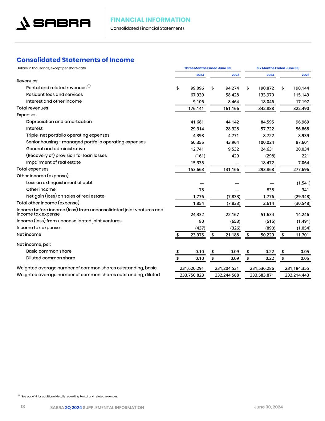 18 SABRA 2Q 2024 SUPPLEMENTAL INFORMATION June 30, 2024 FINANCIAL INFORMATION Consolidated Financial Statements Consolidated Statements of Income Dollars in thousands, except per share data Three Months Ended June 30, Six Months Ended June 30,   2024 2023 2024 2023 Revenues: Rental and related revenues (1) $ 99,096 $ 94,274 $ 190,872 $ 190,144 Resident fees and services 67,939 58,428 133,970 115,149 Interest and other income 9,106 8,464 18,046 17,197 Total revenues 176,141 161,166 342,888 322,490 Expenses: Depreciation and amortization 41,681 44,142 84,595 96,969 Interest 29,314 28,328 57,722 56,868 Triple-net portfolio operating expenses 4,398 4,771 8,722 8,939 Senior housing - managed portfolio operating expenses 50,355 43,964 100,024 87,601 General and administrative 12,741 9,532 24,631 20,034 (Recovery of) provision for loan losses (161) 429 (298) 221 Impairment of real estate 15,335 — 18,472 7,064 Total expenses 153,663 131,166 293,868 277,696 Other income (expense): Loss on extinguishment of debt — — — (1,541) Other income 78 — 838 341 Net gain (loss) on sales of real estate 1,776 (7,833) 1,776 (29,348) Total other income (expense) 1,854 (7,833) 2,614 (30,548) Income before income (loss) from unconsolidated joint ventures and income tax expense 24,332 22,167 51,634 14,246 Income (loss) from unconsolidated joint ventures 80 (653) (515) (1,491) Income tax expense (437) (326) (890) (1,054) Net income $ 23,975 $ 21,188 $ 50,229 $ 11,701 Net income, per: Basic common share $ 0.10 $ 0.09 $ 0.22 $ 0.05 Diluted common share $ 0.10 $ 0.09 $ 0.22 $ 0.05         Weighted average number of common shares outstanding, basic 231,620,291 231,204,531 231,536,286 231,184,355 Weighted average number of common shares outstanding, diluted 233,750,823 232,244,588 233,583,871 232,214,443 (1) See page 19 for additional details regarding Rental and related revenues.