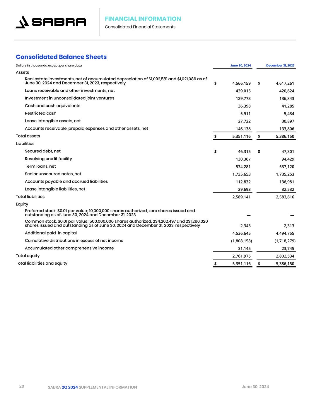 20 SABRA 2Q 2024 SUPPLEMENTAL INFORMATION June 30, 2024 FINANCIAL INFORMATION Consolidated Financial Statements Consolidated Balance Sheets Dollars in thousands, except per share data June 30, 2024 December 31, 2023 Assets Real estate investments, net of accumulated depreciation of $1,092,581 and $1,021,086 as of June 30, 2024 and December 31, 2023, respectively $ 4,566,159 $ 4,617,261 Loans receivable and other investments, net 439,015 420,624 Investment in unconsolidated joint ventures 129,773 136,843 Cash and cash equivalents 36,398 41,285 Restricted cash 5,911 5,434 Lease intangible assets, net 27,722 30,897 Accounts receivable, prepaid expenses and other assets, net 146,138 133,806 Total assets $ 5,351,116 $ 5,386,150 Liabilities Secured debt, net $ 46,315 $ 47,301 Revolving credit facility 130,367 94,429 Term loans, net 534,281 537,120 Senior unsecured notes, net 1,735,653 1,735,253 Accounts payable and accrued liabilities 112,832 136,981 Lease intangible liabilities, net 29,693 32,532 Total liabilities 2,589,141 2,583,616 Equity Preferred stock, $0.01 par value; 10,000,000 shares authorized, zero shares issued and outstanding as of June 30, 2024 and December 31, 2023 — — Common stock, $0.01 par value; 500,000,000 shares authorized, 234,262,497 and 231,266,020 shares issued and outstanding as of June 30, 2024 and December 31, 2023, respectively 2,343 2,313 Additional paid-in capital 4,536,645 4,494,755 Cumulative distributions in excess of net income (1,808,158) (1,718,279) Accumulated other comprehensive income 31,145 23,745 Total equity 2,761,975 2,802,534 Total liabilities and equity $ 5,351,116 $ 5,386,150