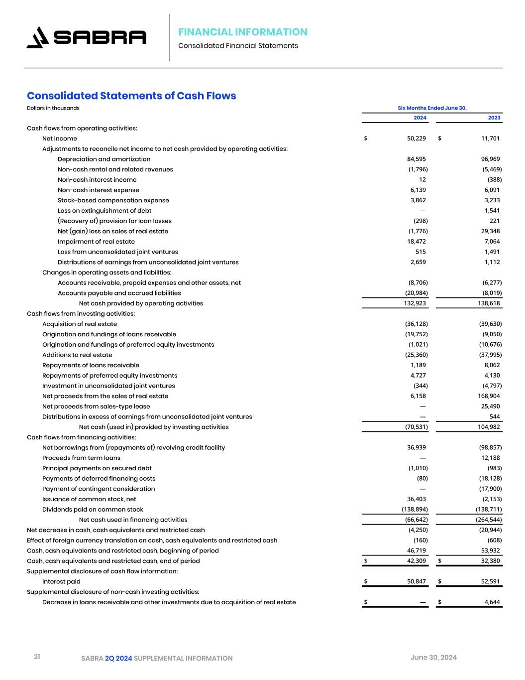 21 SABRA 2Q 2024 SUPPLEMENTAL INFORMATION June 30, 2024 FINANCIAL INFORMATION Consolidated Financial Statements Consolidated Statements of Cash Flows Dollars in thousands Six Months Ended June 30, 2024 2023 Cash flows from operating activities: Net income $ 50,229 $ 11,701 Adjustments to reconcile net income to net cash provided by operating activities: Depreciation and amortization 84,595 96,969 Non-cash rental and related revenues (1,796) (5,469) Non-cash interest income 12 (388) Non-cash interest expense 6,139 6,091 Stock-based compensation expense 3,862 3,233 Loss on extinguishment of debt — 1,541 (Recovery of) provision for loan losses (298) 221 Net (gain) loss on sales of real estate (1,776) 29,348 Impairment of real estate 18,472 7,064 Loss from unconsolidated joint ventures 515 1,491 Distributions of earnings from unconsolidated joint ventures 2,659 1,112 Changes in operating assets and liabilities: Accounts receivable, prepaid expenses and other assets, net (8,706) (6,277) Accounts payable and accrued liabilities (20,984) (8,019) Net cash provided by operating activities 132,923 138,618 Cash flows from investing activities: Acquisition of real estate (36,128) (39,630) Origination and fundings of loans receivable (19,752) (9,050) Origination and fundings of preferred equity investments (1,021) (10,676) Additions to real estate (25,360) (37,995) Repayments of loans receivable 1,189 8,062 Repayments of preferred equity investments 4,727 4,130 Investment in unconsolidated joint ventures (344) (4,797) Net proceeds from the sales of real estate 6,158 168,904 Net proceeds from sales-type lease — 25,490 Distributions in excess of earnings from unconsolidated joint ventures — 544 Net cash (used in) provided by investing activities (70,531) 104,982 Cash flows from financing activities: Net borrowings from (repayments of) revolving credit facility 36,939 (98,857) Proceeds from term loans — 12,188 Principal payments on secured debt (1,010) (983) Payments of deferred financing costs (80) (18,128) Payment of contingent consideration — (17,900) Issuance of common stock, net 36,403 (2,153) Dividends paid on common stock (138,894) (138,711) Net cash used in financing activities (66,642) (264,544) Net decrease in cash, cash equivalents and restricted cash (4,250) (20,944) Effect of foreign currency translation on cash, cash equivalents and restricted cash (160) (608) Cash, cash equivalents and restricted cash, beginning of period 46,719 53,932 Cash, cash equivalents and restricted cash, end of period $ 42,309 $ 32,380 Supplemental disclosure of cash flow information: Interest paid $ 50,847 $ 52,591 Supplemental disclosure of non-cash investing activities: Decrease in loans receivable and other investments due to acquisition of real estate $ — $ 4,644