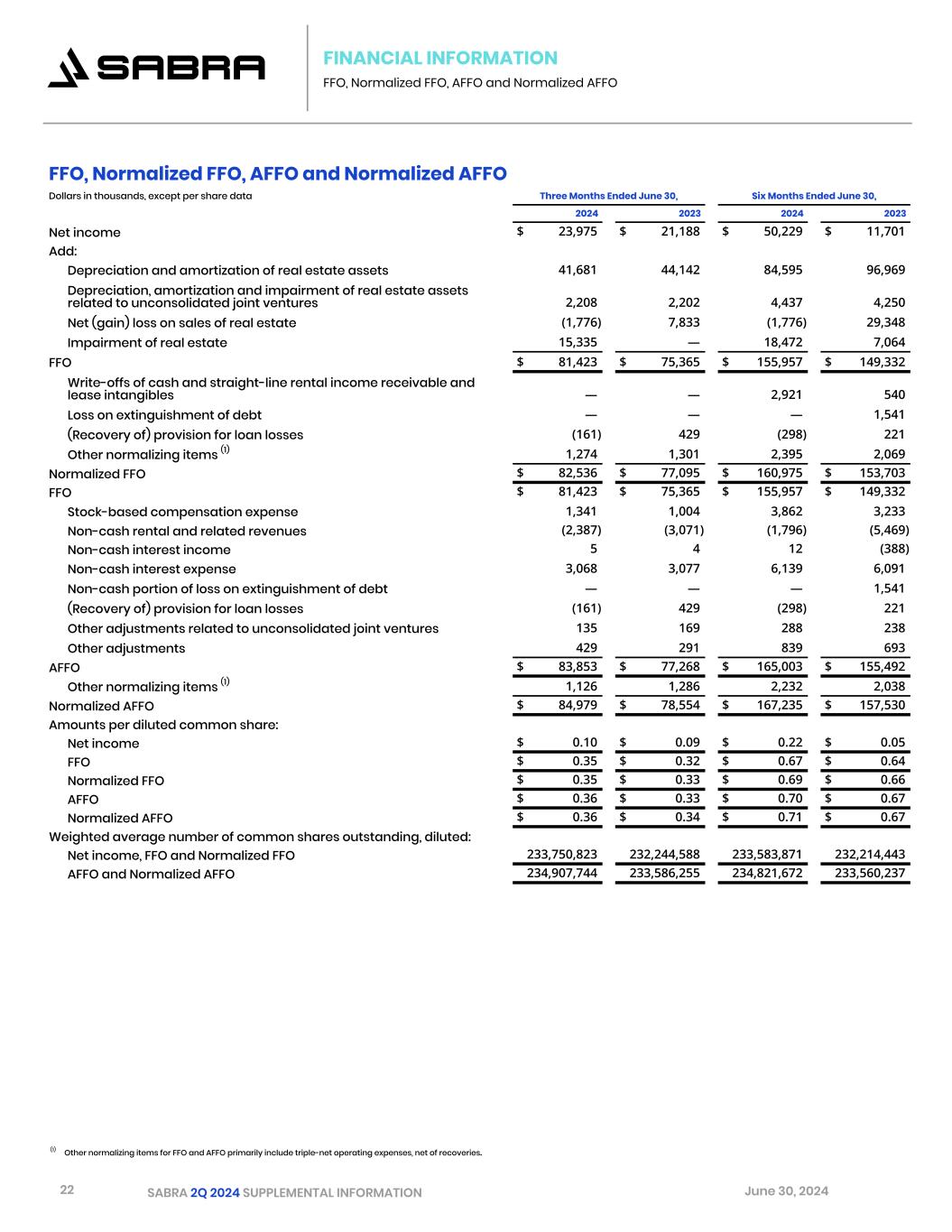 22 SABRA 2Q 2024 SUPPLEMENTAL INFORMATION June 30, 2024 FINANCIAL INFORMATION FFO, Normalized FFO, AFFO and Normalized AFFO (1) Other normalizing items for FFO and AFFO primarily include triple-net operating expenses, net of recoveries. FFO, Normalized FFO, AFFO and Normalized AFFO Dollars in thousands, except per share data Three Months Ended June 30, Six Months Ended June 30,   2024 2023 2024 2023 Net income $ 23,975 $ 21,188 $ 50,229 $ 11,701 Add: Depreciation and amortization of real estate assets 41,681 44,142 84,595 96,969 Depreciation, amortization and impairment of real estate assets related to unconsolidated joint ventures 2,208 2,202 4,437 4,250 Net (gain) loss on sales of real estate (1,776) 7,833 (1,776) 29,348 Impairment of real estate 15,335 — 18,472 7,064 FFO $ 81,423 $ 75,365 $ 155,957 $ 149,332 Write-offs of cash and straight-line rental income receivable and lease intangibles — — 2,921 540 Loss on extinguishment of debt — — — 1,541 (Recovery of) provision for loan losses (161) 429 (298) 221 Other normalizing items (1) 1,274 1,301 2,395 2,069 Normalized FFO $ 82,536 $ 77,095 $ 160,975 $ 153,703 FFO $ 81,423 $ 75,365 $ 155,957 $ 149,332 Stock-based compensation expense 1,341 1,004 3,862 3,233 Non-cash rental and related revenues (2,387) (3,071) (1,796) (5,469) Non-cash interest income 5 4 12 (388) Non-cash interest expense 3,068 3,077 6,139 6,091 Non-cash portion of loss on extinguishment of debt — — — 1,541 (Recovery of) provision for loan losses (161) 429 (298) 221 Other adjustments related to unconsolidated joint ventures 135 169 288 238 Other adjustments 429 291 839 693 AFFO $ 83,853 $ 77,268 $ 165,003 $ 155,492 Other normalizing items (1) 1,126 1,286 2,232 2,038 Normalized AFFO $ 84,979 $ 78,554 $ 167,235 $ 157,530 Amounts per diluted common share: Net income $ 0.10 $ 0.09 $ 0.22 $ 0.05 FFO $ 0.35 $ 0.32 $ 0.67 $ 0.64 Normalized FFO $ 0.35 $ 0.33 $ 0.69 $ 0.66 AFFO $ 0.36 $ 0.33 $ 0.70 $ 0.67 Normalized AFFO $ 0.36 $ 0.34 $ 0.71 $ 0.67 Weighted average number of common shares outstanding, diluted: Net income, FFO and Normalized FFO 233,750,823 232,244,588 233,583,871 232,214,443 AFFO and Normalized AFFO 234,907,744 233,586,255 234,821,672 233,560,237