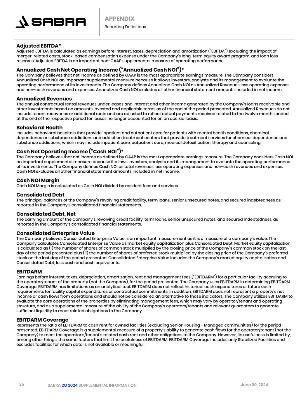 25 SABRA 2Q 2024 SUPPLEMENTAL INFORMATION June 30, 2024 APPENDIX Reporting Definitions Adjusted EBITDA* Adjusted EBITDA is calculated as earnings before interest, taxes, depreciation and amortization (“EBITDA”) excluding the impact of merger-related costs, stock-based compensation expense under the Company's long-term equity award program, and loan loss reserves. Adjusted EBITDA is an important non-GAAP supplemental measure of operating performance. Annualized Cash Net Operating Income (“Annualized Cash NOI”)* The Company believes that net income as defined by GAAP is the most appropriate earnings measure. The Company considers Annualized Cash NOI an important supplemental measure because it allows investors, analysts and its management to evaluate the operating performance of its investments. The Company defines Annualized Cash NOI as Annualized Revenues less operating expenses and non-cash revenues and expenses. Annualized Cash NOI excludes all other financial statement amounts included in net income. Annualized Revenues  The annual contractual rental revenues under leases and interest and other income generated by the Company’s loans receivable and other investments based on amounts invested and applicable terms as of the end of the period presented. Annualized Revenues do not include tenant recoveries or additional rents and are adjusted to reflect actual payments received related to the twelve months ended at the end of the respective period for leases no longer accounted for on an accrual basis. Behavioral Health Includes behavioral hospitals that provide inpatient and outpatient care for patients with mental health conditions, chemical dependence or substance addictions and addiction treatment centers that provide treatment services for chemical dependence and substance addictions, which may include inpatient care, outpatient care, medical detoxification, therapy and counseling. Cash Net Operating Income (“Cash NOI”)*    The Company believes that net income as defined by GAAP is the most appropriate earnings measure. The Company considers Cash NOI an important supplemental measure because it allows investors, analysts and its management to evaluate the operating performance of its investments. The Company defines Cash NOI as total revenues less operating expenses and non-cash revenues and expenses. Cash NOI excludes all other financial statement amounts included in net income. Cash NOI Margin Cash NOI Margin is calculated as Cash NOI divided by resident fees and services. Consolidated Debt  The principal balances of the Company’s revolving credit facility, term loans, senior unsecured notes, and secured indebtedness as reported in the Company’s consolidated financial statements. Consolidated Debt, Net The carrying amount of the Company’s revolving credit facility, term loans, senior unsecured notes, and secured indebtedness, as reported in the Company’s consolidated financial statements. Consolidated Enterprise Value The Company believes Consolidated Enterprise Value is an important measurement as it is a measure of a company’s value. The Company calculates Consolidated Enterprise Value as market equity capitalization plus Consolidated Debt. Market equity capitalization is calculated as (i) the number of shares of common stock multiplied by the closing price of the Company’s common stock on the last day of the period presented plus (ii) the number of shares of preferred stock multiplied by the closing price of the Company’s preferred stock on the last day of the period presented. Consolidated Enterprise Value includes the Company’s market equity capitalization and Consolidated Debt, less cash and cash equivalents. EBITDARM  Earnings before interest, taxes, depreciation, amortization, rent and management fees (“EBITDARM”) for a particular facility accruing to the operator/tenant of the property (not the Company), for the period presented. The Company uses EBITDARM in determining EBITDARM Coverage. EBITDARM has limitations as an analytical tool. EBITDARM does not reflect historical cash expenditures or future cash requirements for facility capital expenditures or contractual commitments. In addition, EBITDARM does not represent a property’s net income or cash flows from operations and should not be considered an alternative to those indicators. The Company utilizes EBITDARM to evaluate the core operations of the properties by eliminating management fees, which may vary by operator/tenant and operating structure, and as a supplemental measure of the ability of the Company’s operators/tenants and relevant guarantors to generate sufficient liquidity to meet related obligations to the Company. EBITDARM Coverage  Represents the ratio of EBITDARM to cash rent for owned facilities (excluding Senior Housing - Managed communities) for the period presented. EBITDARM Coverage is a supplemental measure of a property’s ability to generate cash flows for the operator/tenant (not the Company) to meet the operator’s/tenant’s related cash rent and other obligations to the Company. However, its usefulness is limited by, among other things, the same factors that limit the usefulness of EBITDARM. EBITDARM Coverage includes only Stabilized Facilities and excludes facilities for which data is not available or meaningful.