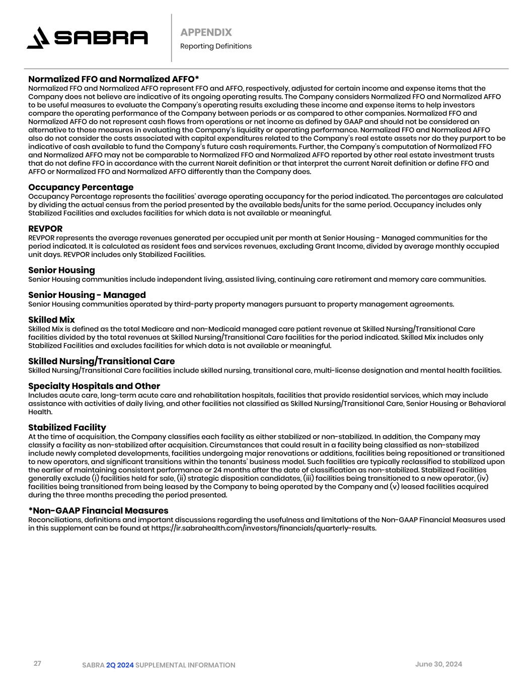 27 SABRA 2Q 2024 SUPPLEMENTAL INFORMATION June 30, 2024 APPENDIX Reporting Definitions Normalized FFO and Normalized AFFO* Normalized FFO and Normalized AFFO represent FFO and AFFO, respectively, adjusted for certain income and expense items that the Company does not believe are indicative of its ongoing operating results. The Company considers Normalized FFO and Normalized AFFO to be useful measures to evaluate the Company’s operating results excluding these income and expense items to help investors compare the operating performance of the Company between periods or as compared to other companies. Normalized FFO and Normalized AFFO do not represent cash flows from operations or net income as defined by GAAP and should not be considered an alternative to those measures in evaluating the Company’s liquidity or operating performance. Normalized FFO and Normalized AFFO also do not consider the costs associated with capital expenditures related to the Company’s real estate assets nor do they purport to be indicative of cash available to fund the Company’s future cash requirements. Further, the Company’s computation of Normalized FFO and Normalized AFFO may not be comparable to Normalized FFO and Normalized AFFO reported by other real estate investment trusts that do not define FFO in accordance with the current Nareit definition or that interpret the current Nareit definition or define FFO and AFFO or Normalized FFO and Normalized AFFO differently than the Company does. Occupancy Percentage Occupancy Percentage represents the facilities’ average operating occupancy for the period indicated. The percentages are calculated by dividing the actual census from the period presented by the available beds/units for the same period. Occupancy includes only Stabilized Facilities and excludes facilities for which data is not available or meaningful. REVPOR REVPOR represents the average revenues generated per occupied unit per month at Senior Housing - Managed communities for the period indicated. It is calculated as resident fees and services revenues, excluding Grant Income, divided by average monthly occupied unit days. REVPOR includes only Stabilized Facilities. Senior Housing  Senior Housing communities include independent living, assisted living, continuing care retirement and memory care communities. Senior Housing - Managed Senior Housing communities operated by third-party property managers pursuant to property management agreements. Skilled Mix  Skilled Mix is defined as the total Medicare and non-Medicaid managed care patient revenue at Skilled Nursing/Transitional Care facilities divided by the total revenues at Skilled Nursing/Transitional Care facilities for the period indicated. Skilled Mix includes only Stabilized Facilities and excludes facilities for which data is not available or meaningful. Skilled Nursing/Transitional Care Skilled Nursing/Transitional Care facilities include skilled nursing, transitional care, multi-license designation and mental health facilities. Specialty Hospitals and Other Includes acute care, long-term acute care and rehabilitation hospitals, facilities that provide residential services, which may include assistance with activities of daily living, and other facilities not classified as Skilled Nursing/Transitional Care, Senior Housing or Behavioral Health. Stabilized Facility At the time of acquisition, the Company classifies each facility as either stabilized or non-stabilized. In addition, the Company may classify a facility as non-stabilized after acquisition. Circumstances that could result in a facility being classified as non-stabilized include newly completed developments, facilities undergoing major renovations or additions, facilities being repositioned or transitioned to new operators, and significant transitions within the tenants’ business model. Such facilities are typically reclassified to stabilized upon the earlier of maintaining consistent performance or 24 months after the date of classification as non-stabilized. Stabilized Facilities generally exclude (i) facilities held for sale, (ii) strategic disposition candidates, (iii) facilities being transitioned to a new operator, (iv) facilities being transitioned from being leased by the Company to being operated by the Company and (v) leased facilities acquired during the three months preceding the period presented. *Non-GAAP Financial Measures Reconciliations, definitions and important discussions regarding the usefulness and limitations of the Non-GAAP Financial Measures used in this supplement can be found at https://ir.sabrahealth.com/investors/financials/quarterly-results.