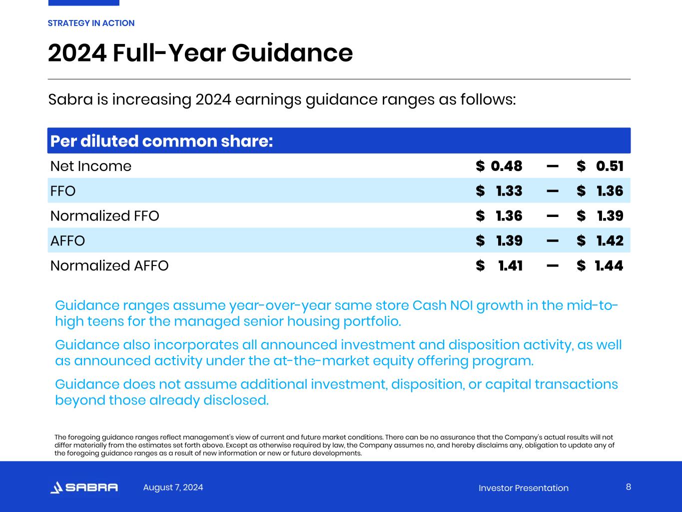 August 7, 2024 Investor Presentation 2024 Full-Year Guidance 8 STRATEGY IN ACTION Per diluted common share: Net Income $ 0.48 — $ 0.51 FFO $ 1.33 — $ 1.36 Normalized FFO $ 1.36 — $ 1.39 AFFO $ 1.39 — $ 1.42 Normalized AFFO $ 1.41 — $ 1.44 Guidance ranges assume year-over-year same store Cash NOI growth in the mid-to- high teens for the managed senior housing portfolio. Guidance also incorporates all announced investment and disposition activity, as well as announced activity under the at-the-market equity offering program. Guidance does not assume additional investment, disposition, or capital transactions beyond those already disclosed. Sabra is increasing 2024 earnings guidance ranges as follows: The foregoing guidance ranges reflect management’s view of current and future market conditions. There can be no assurance that the Company’s actual results will not differ materially from the estimates set forth above. Except as otherwise required by law, the Company assumes no, and hereby disclaims any, obligation to update any of the foregoing guidance ranges as a result of new information or new or future developments.