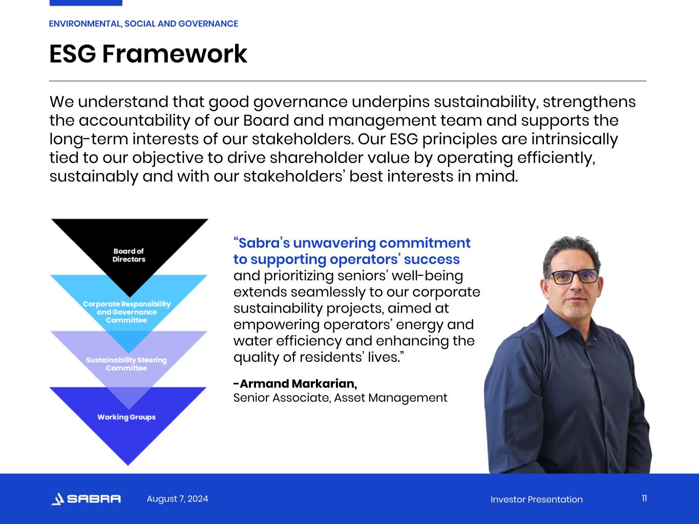 August 7, 2024 Investor Presentation Good for the Planet. Good for Our Stakeholders. Learn more about our commitment to strong corporate governance and our ongoing ESG efforts in our latest corporate sustainability report available on our website at https://sabrahealth.com/about/corporate-sustainability/. “We’re committed to true alignment between our business strategy and our sustainability initiatives. These efforts matter to our stakeholders not only because they are the right thing to do but also because they’re an important part of how we create long-term value.” -Rick Matros (he/him), Chief Executive Officer 10 ENVIRONMENTAL, SOCIAL AND GOVERNANCE
