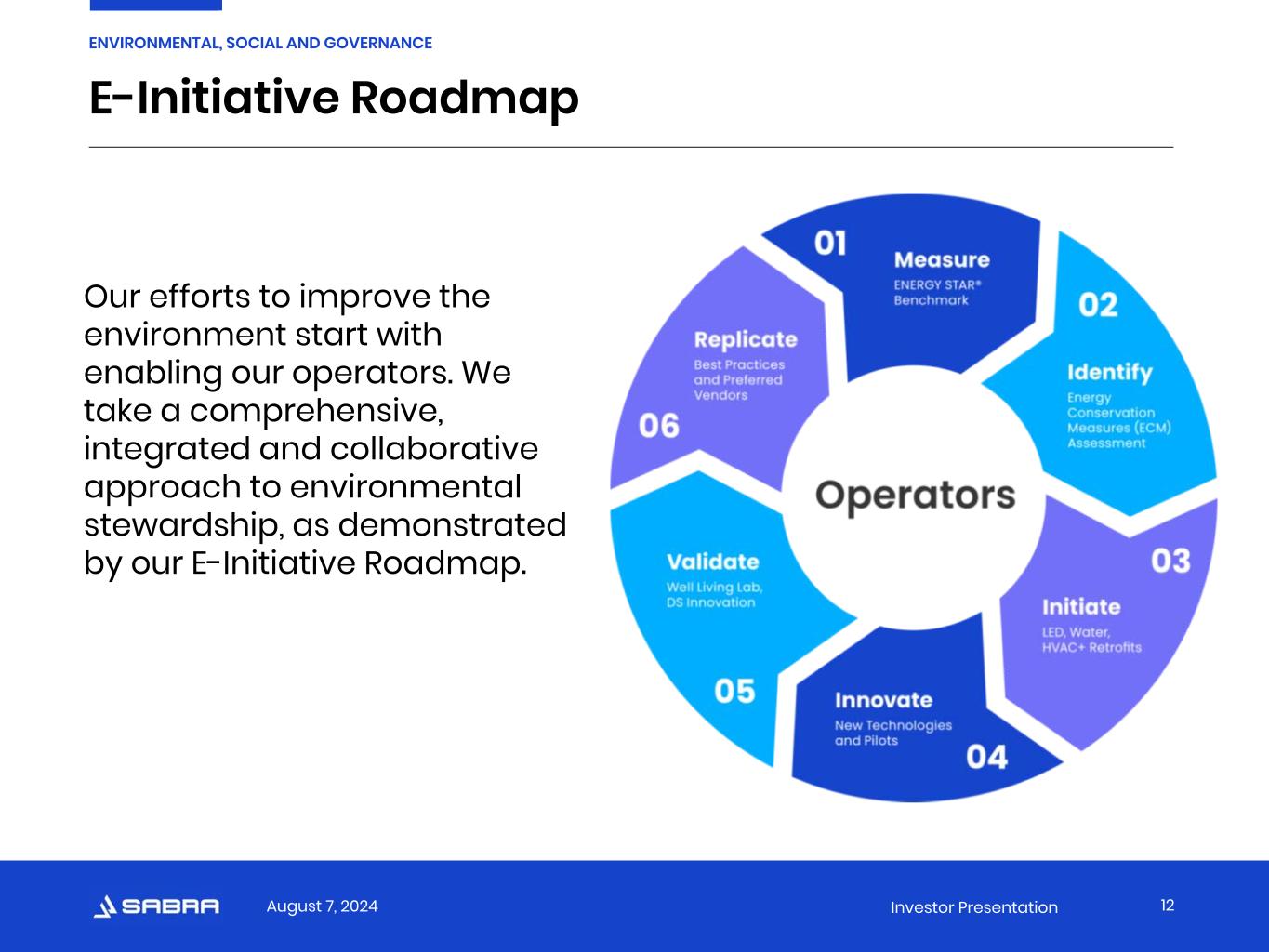 August 7, 2024 Investor Presentation ESG Framework “Sabra’s unwavering commitment to supporting operators’ success and prioritizing seniors’ well-being extends seamlessly to our corporate sustainability projects, aimed at empowering operators’ energy and water efficiency and enhancing the quality of residents’ lives.” -Armand Markarian, Senior Associate, Asset Management 11 ENVIRONMENTAL, SOCIAL AND GOVERNANCE We understand that good governance underpins sustainability, strengthens the accountability of our Board and management team and supports the long-term interests of our stakeholders. Our ESG principles are intrinsically tied to our objective to drive shareholder value by operating efficiently, sustainably and with our stakeholders’ best interests in mind.