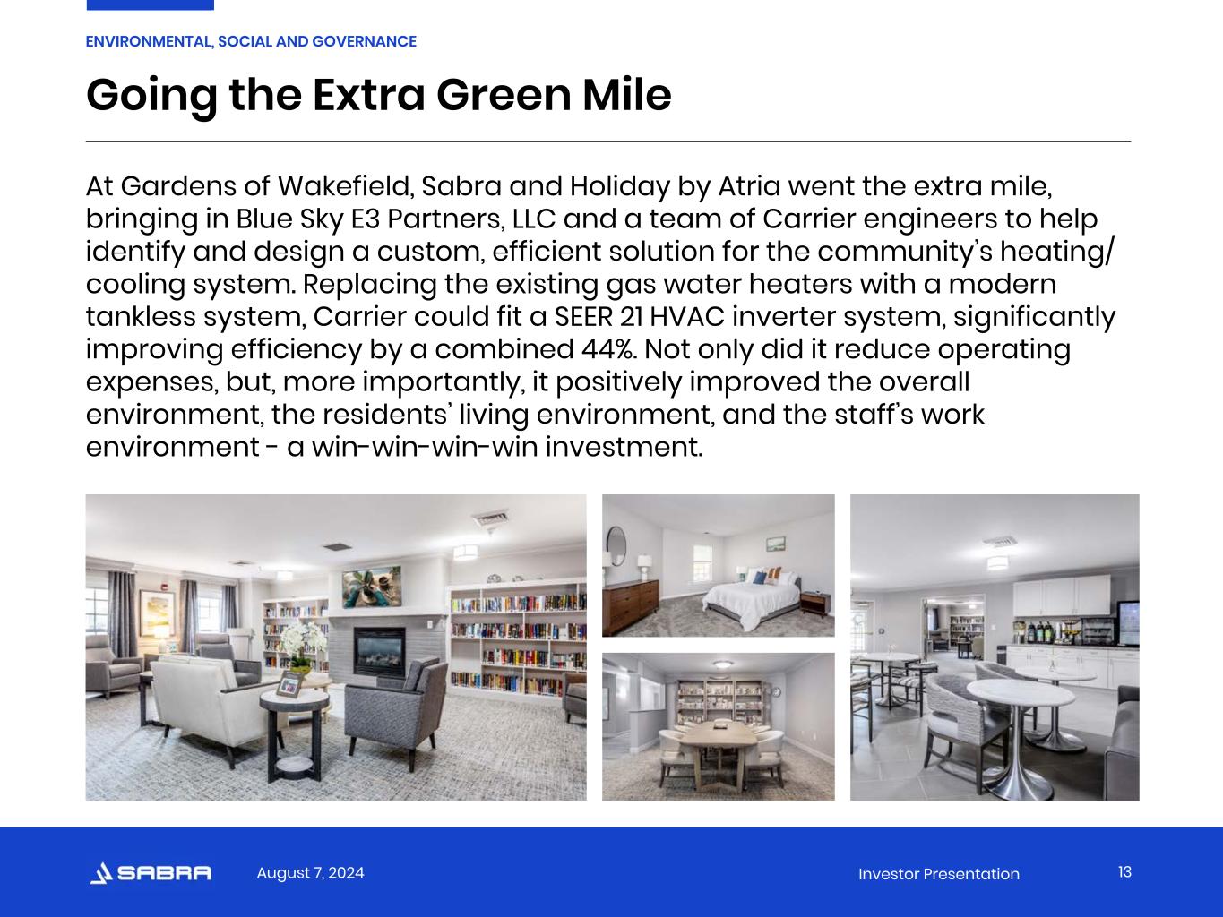August 7, 2024 Investor Presentation Going the Extra Green Mile 13 ENVIRONMENTAL, SOCIAL AND GOVERNANCE At Gardens of Wakefield, Sabra and Holiday by Atria went the extra mile, bringing in Blue Sky E3 Partners, LLC and a team of Carrier engineers to help identify and design a custom, efficient solution for the community’s heating/ cooling system. Replacing the existing gas water heaters with a modern tankless system, Carrier could fit a SEER 21 HVAC inverter system, significantly improving efficiency by a combined 44%. Not only did it reduce operating expenses, but, more importantly, it positively improved the overall environment, the residents’ living environment, and the staff’s work environment - a win-win-win-win investment.