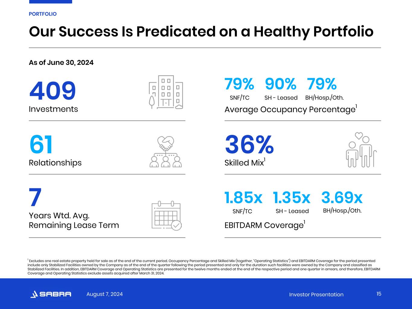 August 7, 2024 Investor Presentation Tenant and Borrower Information This presentation includes information (e.g., EBITDARM Coverage and Occupancy Percentage) regarding certain of our tenants that lease properties from us and our borrowers, most of which are not subject to SEC reporting requirements. The information related to our tenants and borrowers that is provided in this presentation has been provided by, or derived from information provided by, such tenants and borrowers. We have not independently verified this information. We have no reason to believe that such information is inaccurate in any material respect. We are providing this data for informational purposes only. Non-GAAP Financial Measures This presentation contains certain non-GAAP financial measures related to Sabra Health Care REIT, Inc., including Annualized Cash NOI, Net Debt to Adjusted EBITDA and funds from operations (FFO). These measures may be different than non-GAAP financial measures used by other companies, and the presentation of these measures is not intended to be considered in isolation or as a substitute for financial information prepared and presented in accordance with U.S. generally accepted accounting principles (GAAP). An explanation of these non-GAAP financial measures is included under “Definitions” in the Appendix, and reconciliations of these non-GAAP financial measures to the GAAP financial measures we consider most comparable are included on the Investors section of our website at https://ir.sabrahealth.com/investors/financials/quarterly-results. Disclaimers 3
