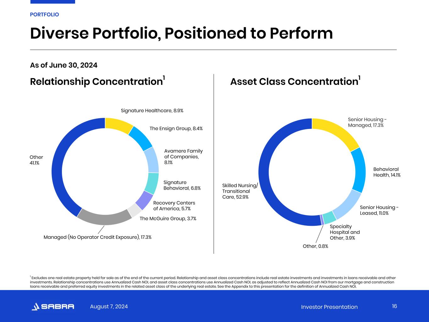August 7, 2024 Investor Presentation Normalized FFO and Normalized AFFO.* Normalized FFO and Normalized AFFO represent FFO and AFFO, respectively, adjusted for certain income and expense items that the Company does not believe are indicative of its ongoing operating results. The Company considers Normalized FFO and Normalized AFFO to be useful measures to evaluate the Company’s operating results excluding these income and expense items to help investors compare the operating performance of the Company between periods or as compared to other companies. Normalized FFO and Normalized AFFO do not represent cash flows from operations or net income as defined by GAAP and should not be considered an alternative to those measures in evaluating the Company’s liquidity or operating performance. Normalized FFO and Normalized AFFO also do not consider the costs associated with capital expenditures related to the Company’s real estate assets nor do they purport to be indicative of cash available to fund the Company’s future cash requirements. Further, the Company’s computation of Normalized FFO and Normalized AFFO may not be comparable to Normalized FFO and Normalized AFFO reported by other real estate investment trusts that do not define FFO in accordance with the current Nareit definition or that interpret the current Nareit definition or define FFO and AFFO or Normalized FFO and Normalized AFFO differently than the Company does. Occupancy Percentage. Occupancy Percentage represents the facilities’ average operating occupancy for the period indicated. The percentages are calculated by dividing the actual census from the period presented by the available beds/units for the same period. Occupancy includes only Stabilized Facilities and excludes facilities for which data is not available or meaningful. Senior Housing. Senior Housing communities include independent living, assisted living, continuing care retirement and memory care communities. Senior Housing - Managed. Senior Housing communities operated by third-party property managers pursuant to property management agreements. Skilled Mix. Skilled Mix is defined as the total Medicare and non-Medicaid managed care patient revenue at Skilled Nursing/Transitional Care facilities divided by the total revenues at Skilled Nursing/Transitional Care facilities for the period indicated. Skilled Mix includes only Stabilized Facilities and excludes facilities for which data is not available or meaningful. Skilled Nursing/Transitional Care. Skilled Nursing/Transitional Care facilities include skilled nursing, transitional care, multi-license designation and mental health facilities. Specialty Hospitals and Other. Includes acute care, long-term acute care and rehabilitation hospitals, facilities that provide residential services, which may include assistance with activities of daily living, and other facilities not classified as Skilled Nursing/Transitional Care, Senior Housing or Behavioral Health. Stabilized Facility. At the time of acquisition, the Company classifies each facility as either stabilized or non-stabilized. In addition, the Company may classify a facility as non-stabilized after acquisition. Circumstances that could result in a facility being classified as non-stabilized include newly completed developments, facilities undergoing major renovations or additions, facilities being repositioned or transitioned to new operators, and significant transitions within the tenants’ business model. Such facilities are typically reclassified to stabilized upon the earlier of maintaining consistent performance or 24 months after the date of classification as non-stabilized. Stabilized Facilities generally exclude (i) facilities held for sale, (ii) strategic disposition candidates, (iii) facilities being transitioned to a new operator, (iv) facilities being transitioned from being leased by the Company to being operated by the Company and (v) leased facilities acquired during the three months preceding the period presented. * Non-GAAP Financial Measures: Reconciliations, definitions and important discussions regarding the usefulness and limitations of the Non-GAAP Financial Measures used in this presentation can be found at https://ir.sabrahealth.com/investors/financials/quarterly-results. APPENDIX Definitions 32