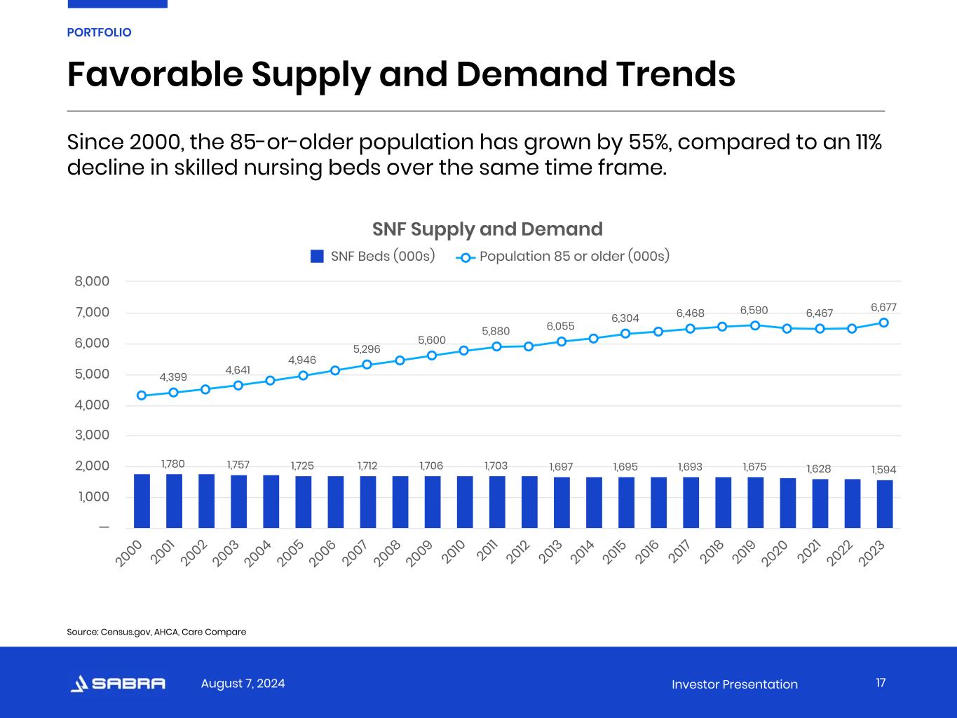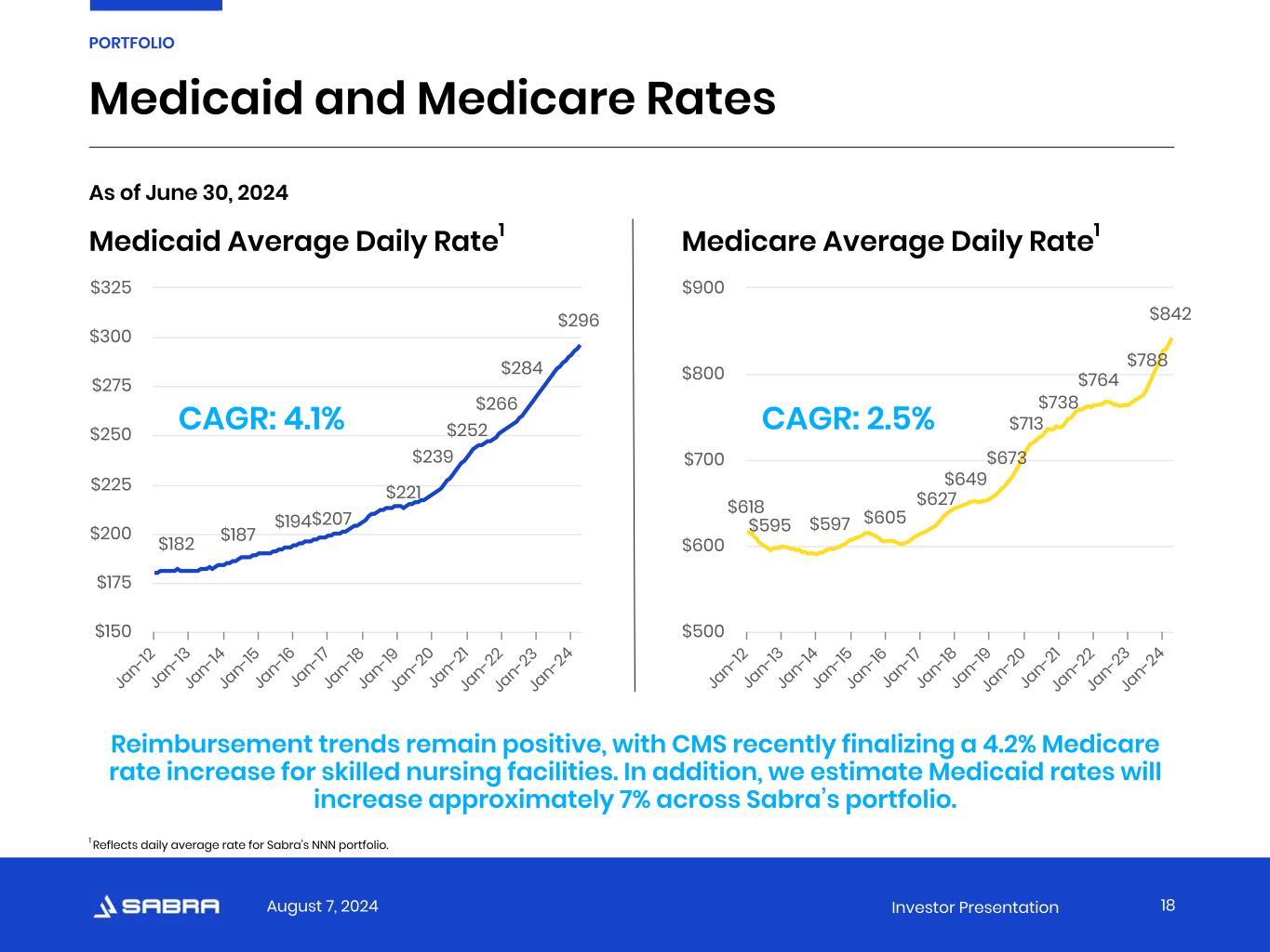 August 7, 2024 Investor Presentation Favorable Supply and Demand Trends 17 PORTFOLIO SNF Supply and Demand 1,780 1,757 1,725 1,712 1,706 1,703 1,697 1,695 1,693 1,675 1,628 1,594 4,399 4,641 4,946 5,296 5,600 5,880 6,055 6,304 6,468 6,590 6,467 6,677 SNF Beds (000s) Population 85 or older (000s) 2000 2001 2002 2003 2004 2005 2006 2007 2008 2009 2010 2011 2012 2013 2014 2015 2016 2017 2018 2019 2020 2021 2022 2023 — 1,000 2,000 3,000 4,000 5,000 6,000 7,000 8,000 Source: Census.gov, AHCA, Care Compare Since 2000, the 85-or-older population has grown by 55%, compared to an 11% decline in skilled nursing beds over the same time frame.