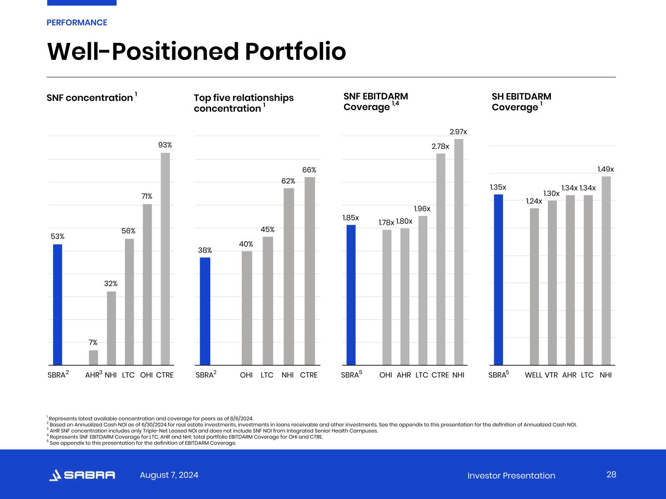 August 7, 2024 Investor Presentation Well-Positioned Portfolio SNF concentration 1 1 Represents latest available concentration and coverage for peers as of 8/6/2024. 2 Based on Annualized Cash NOI as of 6/30/2024 for real estate investments, investments in loans receivable and other investments. See the appendix to this presentation for the definition of Annualized Cash NOI. 3 AHR SNF concentration includes only Triple-Net Leased NOI and does not include SNF NOI from Integrated Senior Health Campuses. 4 Represents SNF EBITDARM Coverage for LTC, AHR and NHI; total portfolio EBITDARM Coverage for OHI and CTRE. 5 See appendix to this presentation for the definition of EBITDARM Coverage. Top five relationships concentration 1 SNF EBITDARM Coverage 1,4 SH EBITDARM Coverage 1 28 PERFORMANCE 53% 7% 32% 56% 71% 93% SBRA AHR NHI LTC OHI CTRE 38% 40% 45% 62% 66% SBRA OHI LTC NHI CTRE 1.85x 1.78x 1.80x 1.96x 2.78x 2.97x SBRA OHI AHR LTC CTRE NHI 1.35x 1.24x 1.30x 1.34x 1.34x 1.49x SBRA WELL VTR AHR LTC NHI2 2 5 53