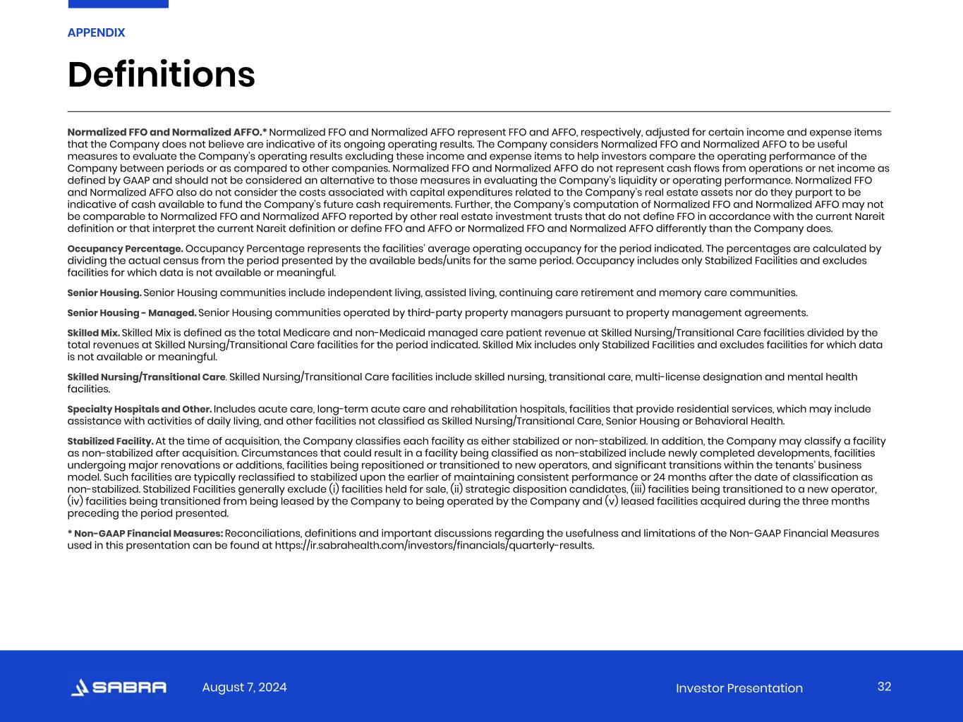 August 7, 2024 Investor Presentation Funds From Operations (“FFO”) and Adjusted FFO (“AFFO”).*  The Company believes that net income as defined by GAAP is the most appropriate earnings measure. The Company also believes that funds from operations, or FFO, as defined in accordance with the definition used by the National Association of Real Estate Investment Trusts (“Nareit”), and adjusted funds from operations, or AFFO (and related per share amounts) are important non-GAAP supplemental measures of the Company’s operating performance. Because the historical cost accounting convention used for real estate assets requires straight-line depreciation (except on land), such accounting presentation implies that the value of real estate assets diminishes predictably over time. However, since real estate values have historically risen or fallen with market and other conditions, presentations of operating results for a real estate investment trust that uses historical cost accounting for depreciation could be less informative. Thus, Nareit created FFO as a supplemental measure of operating performance for real estate investment trusts that excludes historical cost depreciation and amortization, among other items, from net income, as defined by GAAP. FFO is defined as net income, computed in accordance with GAAP, excluding gains or losses from real estate dispositions and the Company’s share of gains or losses from real estate dispositions related to its unconsolidated joint ventures, plus real estate depreciation and amortization, net of amounts related to noncontrolling interests, plus the Company’s share of depreciation and amortization related to its unconsolidated joint ventures, and real estate impairment charges of both consolidated and unconsolidated entities when the impairment is directly attributable to decreases in the value of depreciable real estate held by the entity. AFFO is defined as FFO excluding stock-based compensation expense, non-cash rental and related revenues, non-cash interest income, non-cash interest expense, non-cash portion of loss on extinguishment of debt, provision for (recovery of) loan losses and other reserves, non-cash lease termination income and deferred income taxes, as well as other non-cash revenue and expense items (including noncapitalizable acquisition costs, transaction costs related to operator transitions and organizational or other restructuring activities, ineffectiveness gain/loss on derivative instruments, and non-cash revenue and expense amounts related to noncontrolling interests) and the Company’s share of non-cash adjustments related to its unconsolidated joint ventures. The Company believes that the use of FFO and AFFO (and the related per share amounts), combined with the required GAAP presentations, improves the understanding of the Company’s operating results among investors and makes comparisons of operating results among real estate investment trusts more meaningful. The Company considers FFO and AFFO to be useful measures for reviewing comparative operating and financial performance because, by excluding the applicable items listed above, FFO and AFFO can help investors compare the operating performance of the Company between periods or as compared to other companies. While FFO and AFFO are relevant and widely used measures of operating performance of real estate investment trusts, they do not represent cash flows from operations or net income as defined by GAAP and should not be considered an alternative to those measures in evaluating the Company’s liquidity or operating performance. FFO and AFFO also do not consider the costs associated with capital expenditures related to the Company’s real estate assets nor do they purport to be indicative of cash available to fund the Company’s future cash requirements. Further, the Company’s computation of FFO and AFFO may not be comparable to FFO and AFFO reported by other real estate investment trusts that do not define FFO in accordance with the current Nareit definition or that interpret the current Nareit definition or define AFFO differently than the Company does. Net Debt.* The principal balances of the Company’s revolving credit facility, term loans, senior unsecured notes, and secured indebtedness as reported in the Company’s consolidated financial statements, net of cash and cash equivalents as reported in the Company’s consolidated financial statements. Net Debt to Adjusted EBITDA.* Net Debt to Adjusted EBITDA is calculated as Net Debt divided by Annualized Adjusted EBITDA, which is Adjusted EBITDA, as adjusted for annualizing adjustments that give effect to the acquisitions and dispositions completed during the respective period as though such acquisitions and dispositions were completed as of the beginning of the period presented. Net Operating Income (“NOI”)* The Company believes that net income as defined by GAAP is the most appropriate earnings measure. The Company considers NOI an important supplemental measure because it allows investors, analysts and its management to evaluate the operating performance of its investments. The Company defines NOI as total revenues less operating expenses. NOI excludes all other financial statement amounts included in net income. Definitions 31 APPENDIX