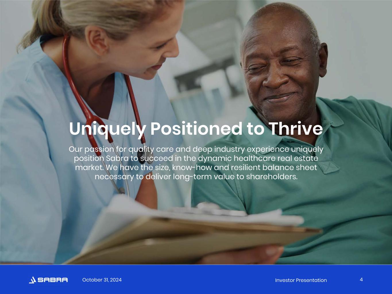October 31, 2024 Investor Presentation Tenant and Borrower Information This presentation includes information (e.g., EBITDARM Coverage and Occupancy Percentage) regarding certain of our tenants that lease properties from us and our borrowers, most of which are not subject to SEC reporting requirements. The information related to our tenants and borrowers that is provided in this presentation has been provided by, or derived from information provided by, such tenants and borrowers. We have not independently verified this information. We have no reason to believe that such information is inaccurate in any material respect. We are providing this data for informational purposes only. Non-GAAP Financial Measures This presentation contains certain non-GAAP financial measures related to Sabra Health Care REIT, Inc., including Annualized Cash NOI, Net Debt to Adjusted EBITDA and funds from operations (FFO). These measures may be different than non-GAAP financial measures used by other companies, and the presentation of these measures is not intended to be considered in isolation or as a substitute for financial information prepared and presented in accordance with U.S. generally accepted accounting principles (GAAP). An explanation of these non-GAAP financial measures is included under “Definitions” in the Appendix, and reconciliations of these non-GAAP financial measures to the GAAP financial measures we consider most comparable are included on the Investors section of our website at https://ir.sabrahealth.com/investors/financials/quarterly-results. Disclaimers 3