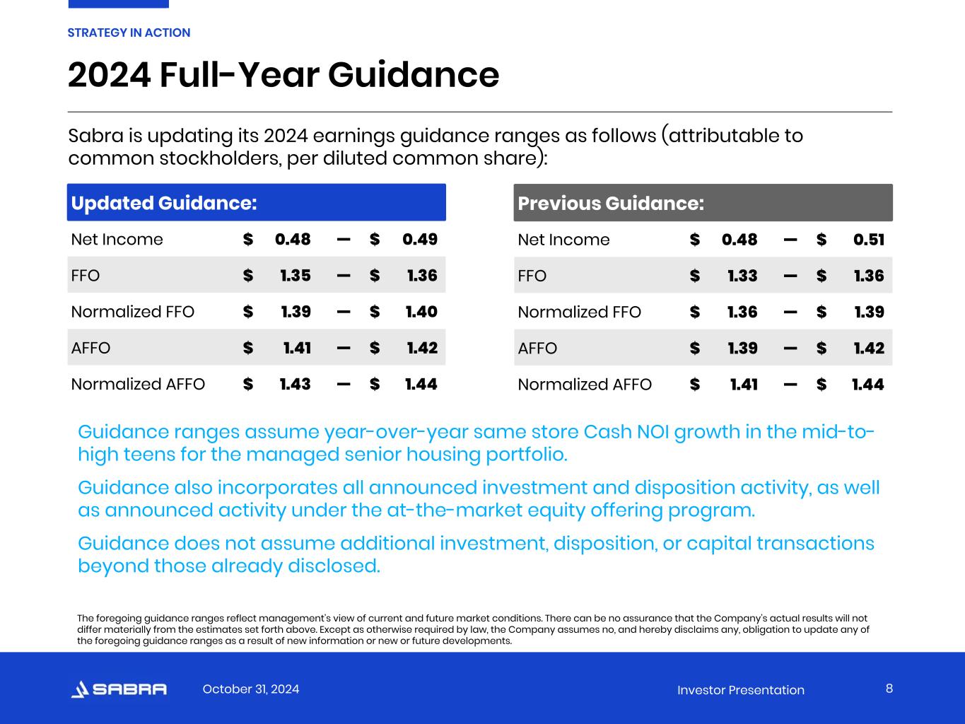 October 31, 2024 Investor Presentation 2024 Full-Year Guidance 8 STRATEGY IN ACTION Updated Guidance: Net Income $ 0.48 — $ 0.49 FFO $ 1.35 — $ 1.36 Normalized FFO $ 1.39 — $ 1.40 AFFO $ 1.41 — $ 1.42 Normalized AFFO $ 1.43 — $ 1.44 Guidance ranges assume year-over-year same store Cash NOI growth in the mid-to- high teens for the managed senior housing portfolio. Guidance also incorporates all announced investment and disposition activity, as well as announced activity under the at-the-market equity offering program. Guidance does not assume additional investment, disposition, or capital transactions beyond those already disclosed. Sabra is updating its 2024 earnings guidance ranges as follows (attributable to common stockholders, per diluted common share): The foregoing guidance ranges reflect management’s view of current and future market conditions. There can be no assurance that the Company’s actual results will not differ materially from the estimates set forth above. Except as otherwise required by law, the Company assumes no, and hereby disclaims any, obligation to update any of the foregoing guidance ranges as a result of new information or new or future developments. Previous Guidance: Net Income $ 0.48 — $ 0.51 FFO $ 1.33 — $ 1.36 Normalized FFO $ 1.36 — $ 1.39 AFFO $ 1.39 — $ 1.42 Normalized AFFO $ 1.41 — $ 1.44