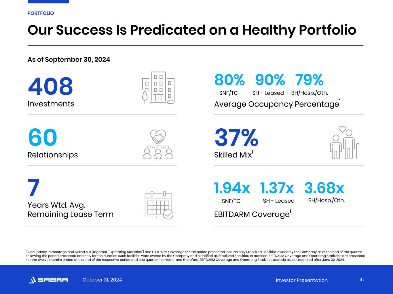 October 31, 2024 Investor Presentation Normalized FFO and Normalized AFFO.* Normalized FFO and Normalized AFFO represent FFO and AFFO, respectively, adjusted for certain income and expense items that the Company does not believe are indicative of its ongoing operating results. The Company considers Normalized FFO and Normalized AFFO to be useful measures to evaluate the Company’s operating results excluding these income and expense items to help investors compare the operating performance of the Company between periods or as compared to other companies. Normalized FFO and Normalized AFFO do not represent cash flows from operations or net income as defined by GAAP and should not be considered an alternative to those measures in evaluating the Company’s liquidity or operating performance. Normalized FFO and Normalized AFFO also do not consider the costs associated with capital expenditures related to the Company’s real estate assets nor do they purport to be indicative of cash available to fund the Company’s future cash requirements. Further, the Company’s computation of Normalized FFO and Normalized AFFO may not be comparable to Normalized FFO and Normalized AFFO reported by other real estate investment trusts that do not define FFO in accordance with the current Nareit definition or that interpret the current Nareit definition or define FFO and AFFO or Normalized FFO and Normalized AFFO differently than the Company does. Occupancy Percentage. Occupancy Percentage represents the facilities’ average operating occupancy for the period indicated. The percentages are calculated by dividing the actual census from the period presented by the available beds/units for the same period. Occupancy includes only Stabilized Facilities and excludes facilities for which data is not available or meaningful. Senior Housing. Senior Housing communities include independent living, assisted living, continuing care retirement and memory care communities. Senior Housing - Managed. Senior Housing communities operated by third-party property managers pursuant to property management agreements. Skilled Mix. Skilled Mix is defined as the total Medicare and non-Medicaid managed care patient revenue at Skilled Nursing/Transitional Care facilities divided by the total revenues at Skilled Nursing/Transitional Care facilities for the period indicated. Skilled Mix includes only Stabilized Facilities and excludes facilities for which data is not available or meaningful. Skilled Nursing/Transitional Care. Skilled Nursing/Transitional Care facilities include skilled nursing, transitional care, multi-license designation and mental health facilities. Specialty Hospitals and Other. Includes acute care, long-term acute care and rehabilitation hospitals, facilities that provide residential services, which may include assistance with activities of daily living, and other facilities not classified as Skilled Nursing/Transitional Care, Senior Housing or Behavioral Health. Stabilized Facility. At the time of acquisition, the Company classifies each facility as either stabilized or non-stabilized. In addition, the Company may classify a facility as non-stabilized after acquisition. Circumstances that could result in a facility being classified as non-stabilized include newly completed developments, facilities undergoing major renovations or additions, facilities being repositioned or transitioned to new operators, and significant transitions within the tenants’ business model. Such facilities are typically reclassified to stabilized upon the earlier of maintaining consistent performance or 24 months after the date of classification as non-stabilized. Stabilized Facilities generally exclude (i) facilities held for sale, (ii) strategic disposition candidates, (iii) facilities being transitioned to a new operator, (iv) facilities being transitioned from being leased by the Company to being operated by the Company and (v) leased facilities acquired during the three months preceding the period presented. * Non-GAAP Financial Measures: Reconciliations, definitions and important discussions regarding the usefulness and limitations of the Non-GAAP Financial Measures used in this presentation can be found at https://ir.sabrahealth.com/investors/financials/quarterly-results. APPENDIX Definitions 32