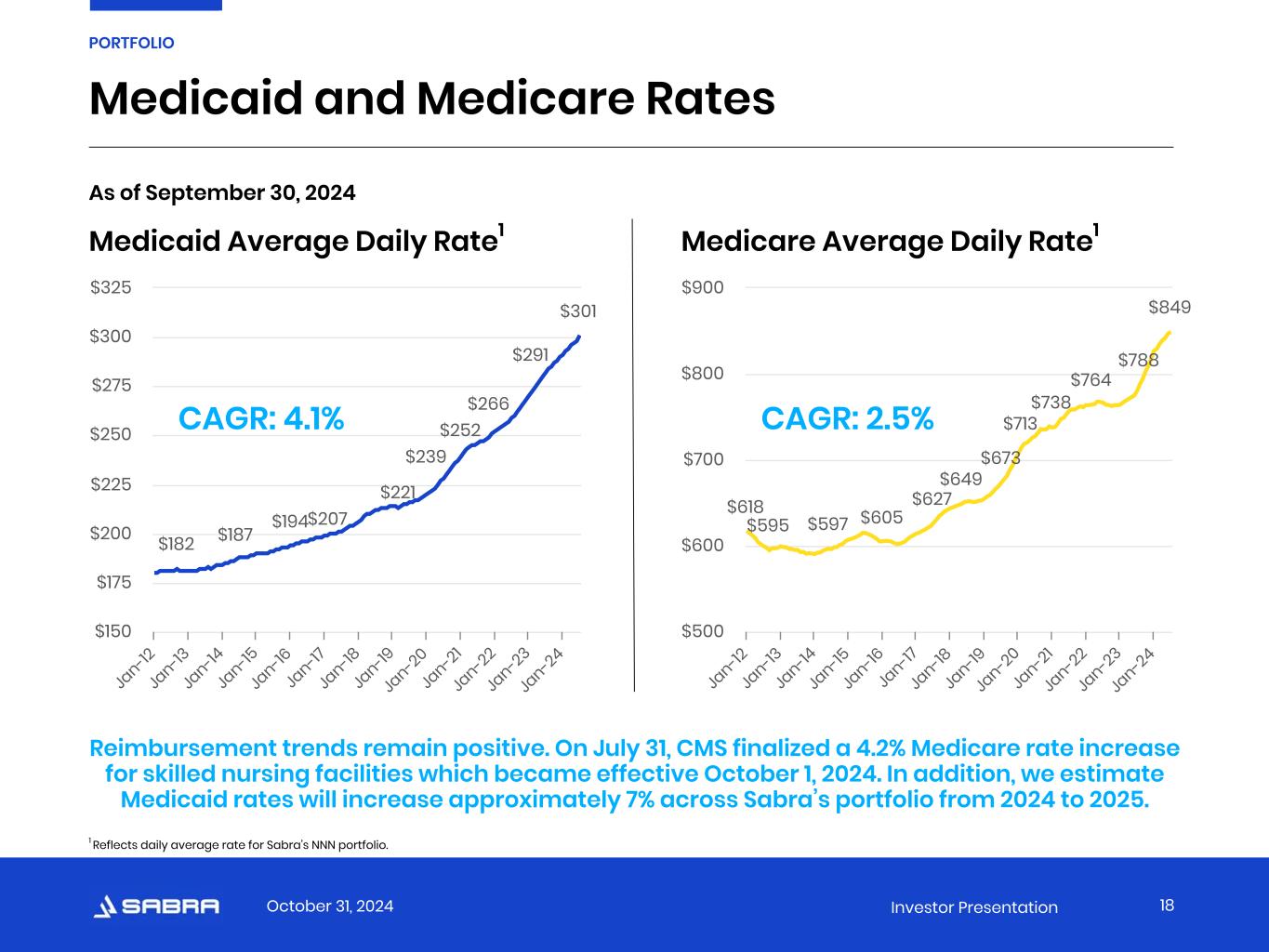 October 31, 2024 Investor Presentation Favorable Supply and Demand Trends 17 PORTFOLIO SNF Supply and Demand 1,780 1,757 1,725 1,712 1,706 1,703 1,697 1,695 1,693 1,675 1,628 1,594 4,399 4,641 4,946 5,296 5,600 5,880 6,055 6,304 6,468 6,590 6,467 6,677 SNF Beds (000s) Population 85 or older (000s) 2000 2001 2002 2003 2004 2005 2006 2007 2008 2009 2010 2011 2012 2013 2014 2015 2016 2017 2018 2019 2020 2021 2022 2023 — 1,000 2,000 3,000 4,000 5,000 6,000 7,000 8,000 Source: Census.gov, AHCA, Care Compare Since 2000, the 85-or-older population has grown by 55%, compared to an 11% decline in skilled nursing beds over the same time frame.