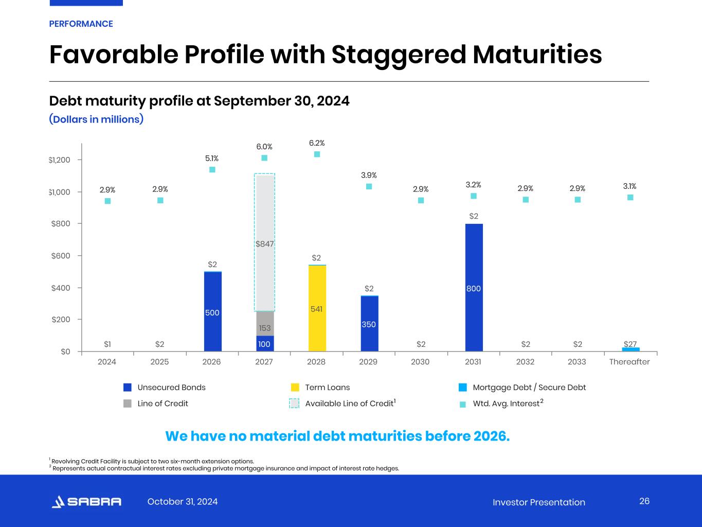 October 31, 2024 Investor Presentation   Sabra 3Q 24 1 Investment-Grade peers range 2 Net Debt to Adjusted EBITDA 5.30x 3 3.73x - 6.27x Interest Coverage Ratio 4.15x 3.70x - 5.55x Debt as a % of Asset Value 37% 27% - 43% Secured Debt as a % of Asset Value 1% 2% - 9% Investment-Grade Credit Metrics 1 Key credit statistics (except Net Debt to Adjusted EBITDA) are calculated in accordance with the credit agreement relating to the revolving credit facility and the indentures relating to our senior unsecured notes. In addition, key credit statistics give effect to dispositions and acquisitions completed after the period presented as though such dispositions and acquisitions occurred at the beginning of the period. 2 Investment-Grade Peers consists of WELL, VTR, OHI and NHI. The metrics used to calculate Investment-Grade peers range are sourced from the most recent public filings with the SEC and may not be calculated in a manner identical to Sabra’s metrics. 3 Based on the annualized trailing three-month period ended as of the date indicated. 25 PERFORMANCE We continue to focus on strengthening our balance sheet and portfolio.