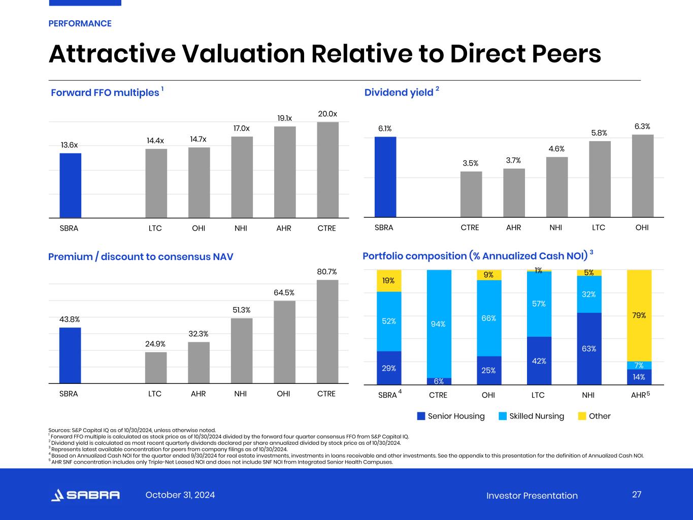 October 31, 2024 Investor Presentation Attractive Valuation Relative to Direct Peers Forward FFO multiples 1 Dividend yield 2 Premium / discount to consensus NAV Portfolio composition (% Annualized Cash NOI) 3 Sources: S&P Capital IQ as of 10/30/2024, unless otherwise noted. 1 Forward FFO multiple is calculated as stock price as of 10/30/2024 divided by the forward four quarter consensus FFO from S&P Capital IQ. 2 Dividend yield is calculated as most recent quarterly dividends declared per share annualized divided by stock price as of 10/30/2024. 3 Represents latest available concentration for peers from company filings as of 10/30/2024. 4 Based on Annualized Cash NOI for the quarter ended 9/30/2024 for real estate investments, investments in loans receivable and other investments. See the appendix to this presentation for the definition of Annualized Cash NOI. 5 AHR SNF concentration includes only Triple-Net Leased NOI and does not include SNF NOI from Integrated Senior Health Campuses. 27 PERFORMANCE 13.6x 14.4x 14.7x 17.0x 19.1x 20.0x SBRA LTC OHI NHI AHR CTRE 6.1% 3.5% 3.7% 4.6% 5.8% 6.3% SBRA CTRE AHR NHI LTC OHI 43.8% 24.9% 32.3% 51.3% 64.5% 80.7% SBRA LTC AHR NHI OHI CTRE 29% 6% 25% 42% 63% 14% 52% 94% 66% 57% 32% 7% 19% 9% 1% 5% 79% Senior Housing Skilled Nursing Other SBRA CTRE OHI LTC NHI AHR4 5