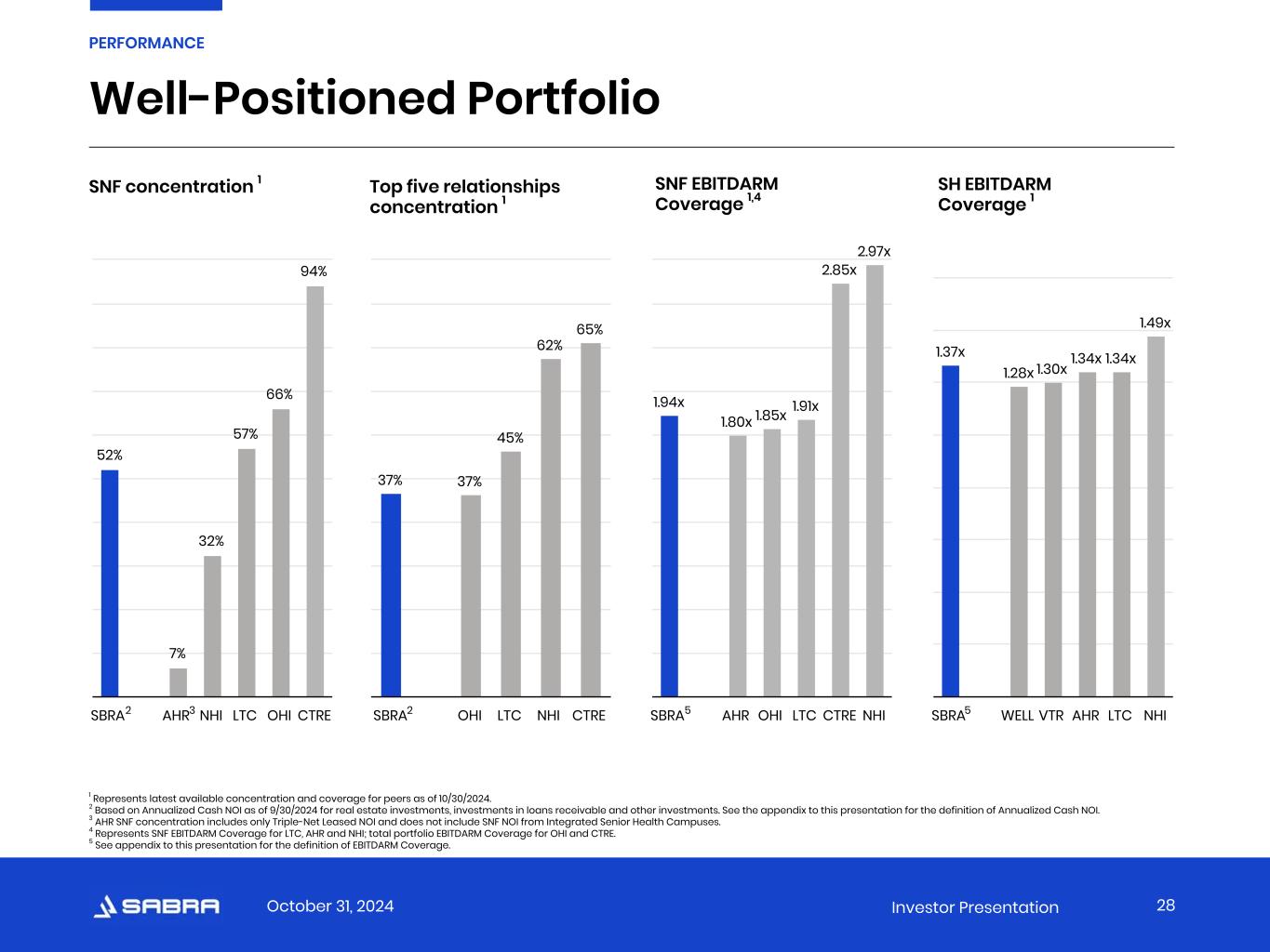 October 31, 2024 Investor Presentation Well-Positioned Portfolio SNF concentration 1 1 Represents latest available concentration and coverage for peers as of 10/30/2024. 2 Based on Annualized Cash NOI as of 9/30/2024 for real estate investments, investments in loans receivable and other investments. See the appendix to this presentation for the definition of Annualized Cash NOI. 3 AHR SNF concentration includes only Triple-Net Leased NOI and does not include SNF NOI from Integrated Senior Health Campuses. 4 Represents SNF EBITDARM Coverage for LTC, AHR and NHI; total portfolio EBITDARM Coverage for OHI and CTRE. 5 See appendix to this presentation for the definition of EBITDARM Coverage. Top five relationships concentration 1 SNF EBITDARM Coverage 1,4 SH EBITDARM Coverage 1 28 PERFORMANCE 52% 7% 32% 57% 66% 94% SBRA AHR NHI LTC OHI CTRE 37% 37% 45% 62% 65% SBRA OHI LTC NHI CTRE 1.94x 1.80x 1.85x 1.91x 2.85x 2.97x SBRA AHR OHI LTC CTRE NHI 1.37x 1.28x 1.30x 1.34x 1.34x 1.49x SBRA WELL VTR AHR LTC NHI2 2 5 53