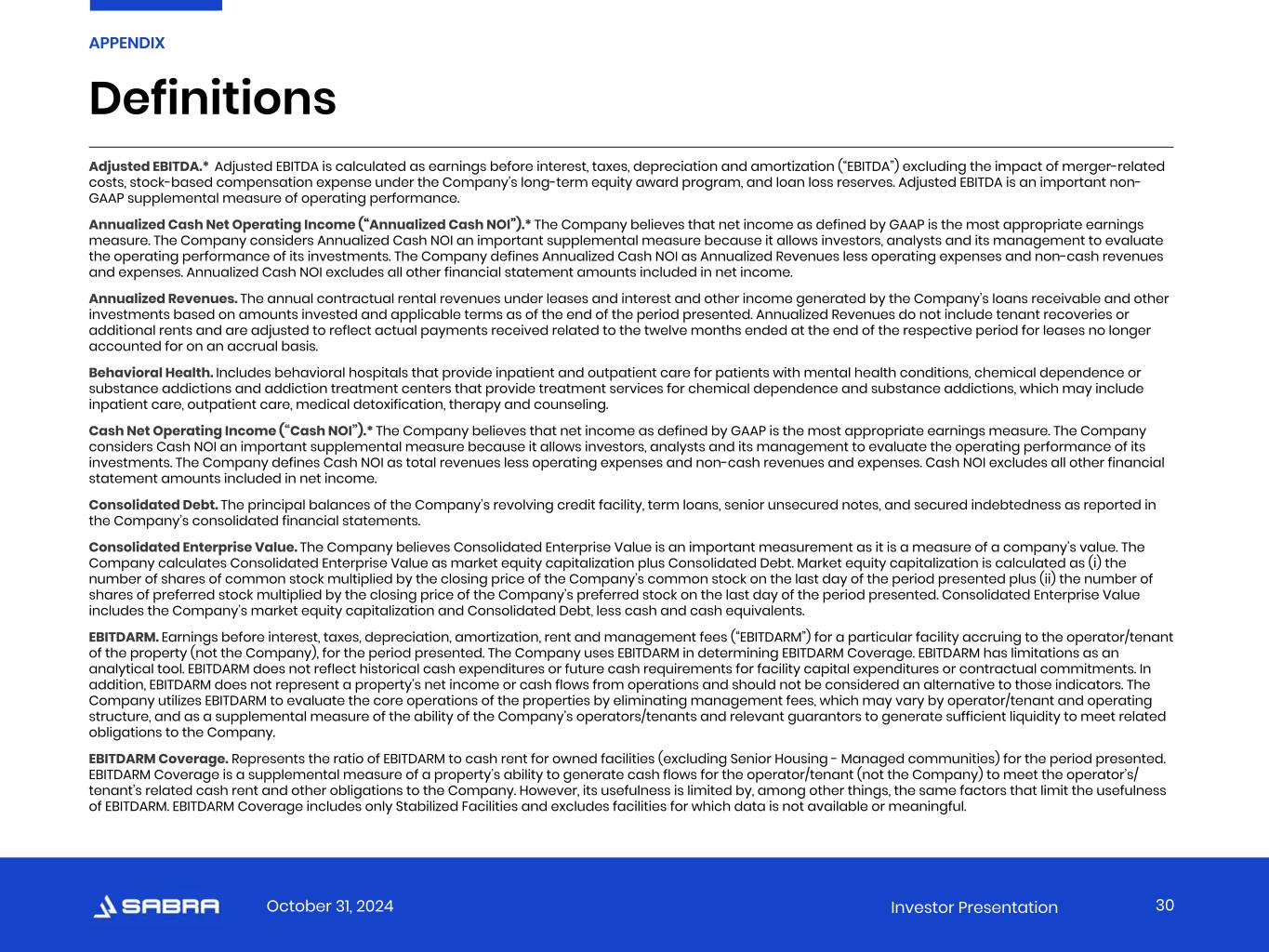 October 31, 2024 Investor Presentation Adjusted EBITDA.* Adjusted EBITDA is calculated as earnings before interest, taxes, depreciation and amortization (“EBITDA”) excluding the impact of merger-related costs, stock-based compensation expense under the Company’s long-term equity award program, and loan loss reserves. Adjusted EBITDA is an important non- GAAP supplemental measure of operating performance. Annualized Cash Net Operating Income (“Annualized Cash NOI”).* The Company believes that net income as defined by GAAP is the most appropriate earnings measure. The Company considers Annualized Cash NOI an important supplemental measure because it allows investors, analysts and its management to evaluate the operating performance of its investments. The Company defines Annualized Cash NOI as Annualized Revenues less operating expenses and non-cash revenues and expenses. Annualized Cash NOI excludes all other financial statement amounts included in net income. Annualized Revenues. The annual contractual rental revenues under leases and interest and other income generated by the Company’s loans receivable and other investments based on amounts invested and applicable terms as of the end of the period presented. Annualized Revenues do not include tenant recoveries or additional rents and are adjusted to reflect actual payments received related to the twelve months ended at the end of the respective period for leases no longer accounted for on an accrual basis. Behavioral Health. Includes behavioral hospitals that provide inpatient and outpatient care for patients with mental health conditions, chemical dependence or substance addictions and addiction treatment centers that provide treatment services for chemical dependence and substance addictions, which may include inpatient care, outpatient care, medical detoxification, therapy and counseling. Cash Net Operating Income (“Cash NOI”).* The Company believes that net income as defined by GAAP is the most appropriate earnings measure. The Company considers Cash NOI an important supplemental measure because it allows investors, analysts and its management to evaluate the operating performance of its investments. The Company defines Cash NOI as total revenues less operating expenses and non-cash revenues and expenses. Cash NOI excludes all other financial statement amounts included in net income. Consolidated Debt. The principal balances of the Company’s revolving credit facility, term loans, senior unsecured notes, and secured indebtedness as reported in the Company’s consolidated financial statements. Consolidated Enterprise Value. The Company believes Consolidated Enterprise Value is an important measurement as it is a measure of a company’s value. The Company calculates Consolidated Enterprise Value as market equity capitalization plus Consolidated Debt. Market equity capitalization is calculated as (i) the number of shares of common stock multiplied by the closing price of the Company’s common stock on the last day of the period presented plus (ii) the number of shares of preferred stock multiplied by the closing price of the Company’s preferred stock on the last day of the period presented. Consolidated Enterprise Value includes the Company’s market equity capitalization and Consolidated Debt, less cash and cash equivalents. EBITDARM. Earnings before interest, taxes, depreciation, amortization, rent and management fees (“EBITDARM”) for a particular facility accruing to the operator/tenant of the property (not the Company), for the period presented. The Company uses EBITDARM in determining EBITDARM Coverage. EBITDARM has limitations as an analytical tool. EBITDARM does not reflect historical cash expenditures or future cash requirements for facility capital expenditures or contractual commitments. In addition, EBITDARM does not represent a property’s net income or cash flows from operations and should not be considered an alternative to those indicators. The Company utilizes EBITDARM to evaluate the core operations of the properties by eliminating management fees, which may vary by operator/tenant and operating structure, and as a supplemental measure of the ability of the Company’s operators/tenants and relevant guarantors to generate sufficient liquidity to meet related obligations to the Company. EBITDARM Coverage. Represents the ratio of EBITDARM to cash rent for owned facilities (excluding Senior Housing - Managed communities) for the period presented. EBITDARM Coverage is a supplemental measure of a property’s ability to generate cash flows for the operator/tenant (not the Company) to meet the operator’s/ tenant’s related cash rent and other obligations to the Company. However, its usefulness is limited by, among other things, the same factors that limit the usefulness of EBITDARM. EBITDARM Coverage includes only Stabilized Facilities and excludes facilities for which data is not available or meaningful. Definitions 30 APPENDIX