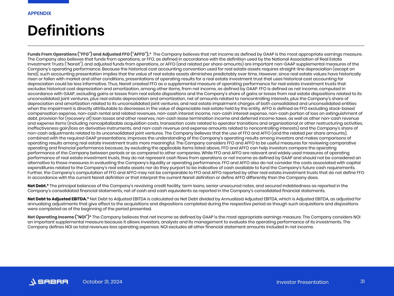October 31, 2024 Investor Presentation Funds From Operations (“FFO”) and Adjusted FFO (“AFFO”).*  The Company believes that net income as defined by GAAP is the most appropriate earnings measure. The Company also believes that funds from operations, or FFO, as defined in accordance with the definition used by the National Association of Real Estate Investment Trusts (“Nareit”), and adjusted funds from operations, or AFFO (and related per share amounts) are important non-GAAP supplemental measures of the Company’s operating performance. Because the historical cost accounting convention used for real estate assets requires straight-line depreciation (except on land), such accounting presentation implies that the value of real estate assets diminishes predictably over time. However, since real estate values have historically risen or fallen with market and other conditions, presentations of operating results for a real estate investment trust that uses historical cost accounting for depreciation could be less informative. Thus, Nareit created FFO as a supplemental measure of operating performance for real estate investment trusts that excludes historical cost depreciation and amortization, among other items, from net income, as defined by GAAP. FFO is defined as net income, computed in accordance with GAAP, excluding gains or losses from real estate dispositions and the Company’s share of gains or losses from real estate dispositions related to its unconsolidated joint ventures, plus real estate depreciation and amortization, net of amounts related to noncontrolling interests, plus the Company’s share of depreciation and amortization related to its unconsolidated joint ventures, and real estate impairment charges of both consolidated and unconsolidated entities when the impairment is directly attributable to decreases in the value of depreciable real estate held by the entity. AFFO is defined as FFO excluding stock-based compensation expense, non-cash rental and related revenues, non-cash interest income, non-cash interest expense, non-cash portion of loss on extinguishment of debt, provision for (recovery of) loan losses and other reserves, non-cash lease termination income and deferred income taxes, as well as other non-cash revenue and expense items (including noncapitalizable acquisition costs, transaction costs related to operator transitions and organizational or other restructuring activities, ineffectiveness gain/loss on derivative instruments, and non-cash revenue and expense amounts related to noncontrolling interests) and the Company’s share of non-cash adjustments related to its unconsolidated joint ventures. The Company believes that the use of FFO and AFFO (and the related per share amounts), combined with the required GAAP presentations, improves the understanding of the Company’s operating results among investors and makes comparisons of operating results among real estate investment trusts more meaningful. The Company considers FFO and AFFO to be useful measures for reviewing comparative operating and financial performance because, by excluding the applicable items listed above, FFO and AFFO can help investors compare the operating performance of the Company between periods or as compared to other companies. While FFO and AFFO are relevant and widely used measures of operating performance of real estate investment trusts, they do not represent cash flows from operations or net income as defined by GAAP and should not be considered an alternative to those measures in evaluating the Company’s liquidity or operating performance. FFO and AFFO also do not consider the costs associated with capital expenditures related to the Company’s real estate assets nor do they purport to be indicative of cash available to fund the Company’s future cash requirements. Further, the Company’s computation of FFO and AFFO may not be comparable to FFO and AFFO reported by other real estate investment trusts that do not define FFO in accordance with the current Nareit definition or that interpret the current Nareit definition or define AFFO differently than the Company does. Net Debt.* The principal balances of the Company’s revolving credit facility, term loans, senior unsecured notes, and secured indebtedness as reported in the Company’s consolidated financial statements, net of cash and cash equivalents as reported in the Company’s consolidated financial statements. Net Debt to Adjusted EBITDA.* Net Debt to Adjusted EBITDA is calculated as Net Debt divided by Annualized Adjusted EBITDA, which is Adjusted EBITDA, as adjusted for annualizing adjustments that give effect to the acquisitions and dispositions completed during the respective period as though such acquisitions and dispositions were completed as of the beginning of the period presented. Net Operating Income (“NOI”)* The Company believes that net income as defined by GAAP is the most appropriate earnings measure. The Company considers NOI an important supplemental measure because it allows investors, analysts and its management to evaluate the operating performance of its investments. The Company defines NOI as total revenues less operating expenses. NOI excludes all other financial statement amounts included in net income. Definitions 31 APPENDIX