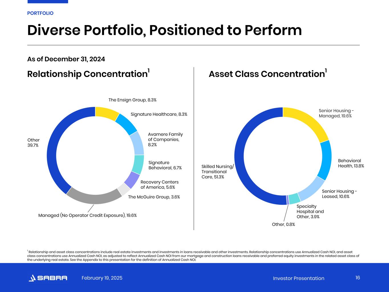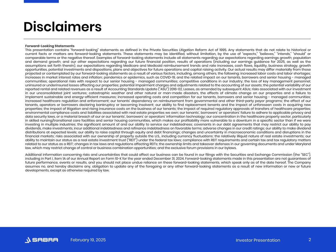 February 19, 2025 Investor Presentation Normalized FFO and Normalized AFFO.* Normalized FFO and Normalized AFFO represent FFO and AFFO, respectively, adjusted for certain income and expense items that the Company does not believe are indicative of its ongoing operating results. The Company considers Normalized FFO and Normalized AFFO to be useful measures to evaluate the Company’s operating results excluding these income and expense items to help investors compare the operating performance of the Company between periods or as compared to other companies. Normalized FFO and Normalized AFFO do not represent cash flows from operations or net income as defined by GAAP and should not be considered an alternative to those measures in evaluating the Company’s liquidity or operating performance. Normalized FFO and Normalized AFFO also do not consider the costs associated with capital expenditures related to the Company’s real estate assets nor do they purport to be indicative of cash available to fund the Company’s future cash requirements. Further, the Company’s computation of Normalized FFO and Normalized AFFO may not be comparable to Normalized FFO and Normalized AFFO reported by other real estate investment trusts that do not define FFO in accordance with the current Nareit definition or that interpret the current Nareit definition or define FFO and AFFO or Normalized FFO and Normalized AFFO differently than the Company does. Occupancy Percentage. Occupancy Percentage represents the facilities’ average operating occupancy for the period indicated. The percentages are calculated by dividing the actual census from the period presented by the available beds/units for the same period. Occupancy includes only Stabilized Facilities and excludes facilities for which data is not available or meaningful. Senior Housing. Senior Housing communities include independent living, assisted living, continuing care retirement and memory care communities. Senior Housing - Managed. Senior Housing communities operated by third-party property managers pursuant to property management agreements. Skilled Mix. Skilled Mix is defined as the total Medicare and non-Medicaid managed care patient revenue at Skilled Nursing/Transitional Care facilities divided by the total revenues at Skilled Nursing/Transitional Care facilities for the period indicated. Skilled Mix includes only Stabilized Facilities and excludes facilities for which data is not available or meaningful. Skilled Nursing/Transitional Care. Skilled Nursing/Transitional Care facilities include skilled nursing, transitional care, multi-license designation and mental health facilities. Specialty Hospitals and Other. Includes acute care, long-term acute care and rehabilitation hospitals, facilities that provide residential services, which may include assistance with activities of daily living, and other facilities not classified as Skilled Nursing/Transitional Care, Senior Housing or Behavioral Health. Stabilized Facility. At the time of acquisition, the Company classifies each facility as either stabilized or non-stabilized. In addition, the Company may classify a facility as non-stabilized after acquisition. Circumstances that could result in a facility being classified as non-stabilized include newly completed developments, facilities undergoing major renovations or additions, facilities being repositioned or transitioned to new operators, and significant transitions within the tenants’ business model. Such facilities are typically reclassified to stabilized upon the earlier of maintaining consistent performance or 24 months after the date of classification as non-stabilized. Stabilized Facilities generally exclude (i) facilities held for sale, (ii) strategic disposition candidates, (iii) facilities being transitioned to a new operator, (iv) facilities being transitioned from being leased by the Company to being operated by the Company and (v) leased facilities acquired during the three months preceding the period presented. * Non-GAAP Financial Measures: Reconciliations, definitions and important discussions regarding the usefulness and limitations of the Non-GAAP Financial Measures used in this presentation can be found at https://ir.sabrahealth.com/investors/financials/quarterly-results. APPENDIX Definitions 32