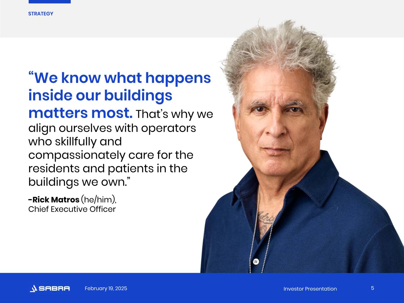 LOREM IPSUM Heading February 19, 2025 Investor Presentation Our passion for quality care and deep industry experience uniquely position Sabra to succeed in the dynamic healthcare real estate market. We have the size, know-how and resilient balance sheet necessary to deliver long-term value to shareholders. Uniquely Positioned to Thrive 4