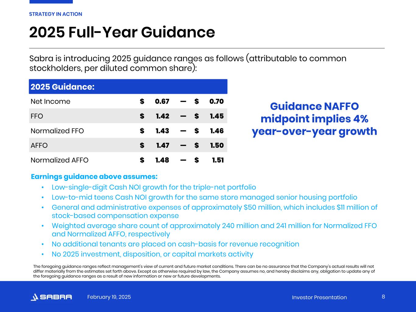 February 19, 2025 Investor Presentation 2025 Full-Year Guidance 8 STRATEGY IN ACTION 2025 Guidance: Net Income $ 0.67 — $ 0.70 FFO $ 1.42 — $ 1.45 Normalized FFO $ 1.43 — $ 1.46 AFFO $ 1.47 — $ 1.50 Normalized AFFO $ 1.48 — $ 1.51 Earnings guidance above assumes: • Low-single-digit Cash NOI growth for the triple-net portfolio • Low-to-mid teens Cash NOI growth for the same store managed senior housing portfolio • General and administrative expenses of approximately $50 million, which includes $11 million of stock-based compensation expense • Weighted average share count of approximately 240 million and 241 million for Normalized FFO and Normalized AFFO, respectively • No additional tenants are placed on cash-basis for revenue recognition • No 2025 investment, disposition, or capital markets activity Sabra is introducing 2025 guidance ranges as follows (attributable to common stockholders, per diluted common share): The foregoing guidance ranges reflect management’s view of current and future market conditions. There can be no assurance that the Company’s actual results will not differ materially from the estimates set forth above. Except as otherwise required by law, the Company assumes no, and hereby disclaims any, obligation to update any of the foregoing guidance ranges as a result of new information or new or future developments. Guidance NAFFO midpoint implies 4% year-over-year growth