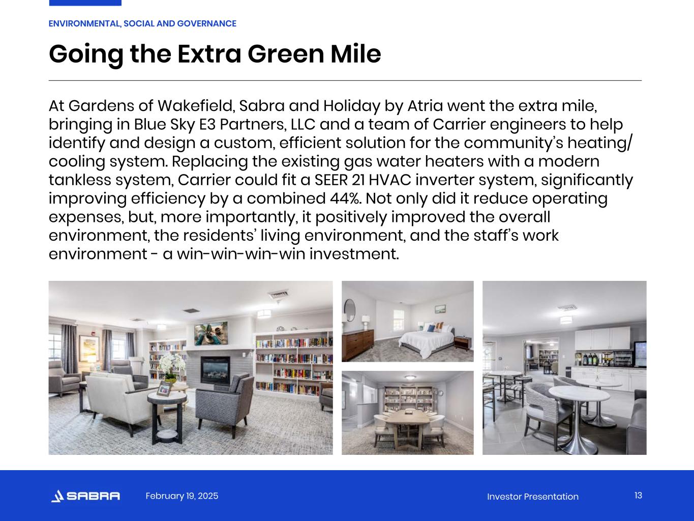 February 19, 2025 Investor Presentation Going the Extra Green Mile 13 ENVIRONMENTAL, SOCIAL AND GOVERNANCE At Gardens of Wakefield, Sabra and Holiday by Atria went the extra mile, bringing in Blue Sky E3 Partners, LLC and a team of Carrier engineers to help identify and design a custom, efficient solution for the community’s heating/ cooling system. Replacing the existing gas water heaters with a modern tankless system, Carrier could fit a SEER 21 HVAC inverter system, significantly improving efficiency by a combined 44%. Not only did it reduce operating expenses, but, more importantly, it positively improved the overall environment, the residents’ living environment, and the staff’s work environment - a win-win-win-win investment.