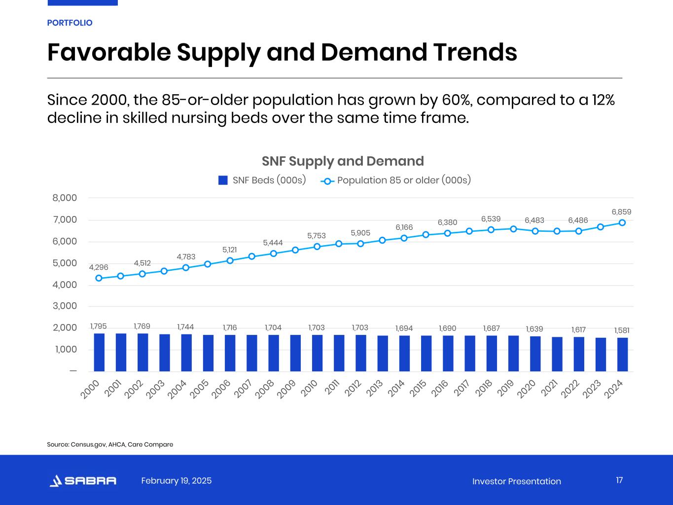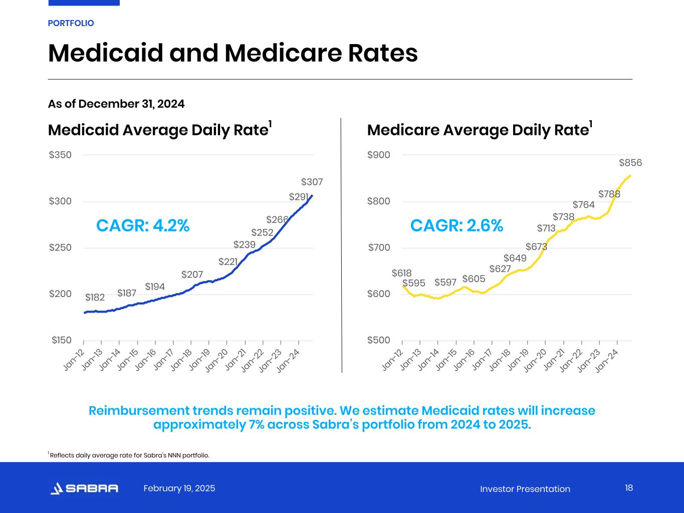 February 19, 2025 Investor Presentation Favorable Supply and Demand Trends 17 PORTFOLIO SNF Supply and Demand 1,795 1,769 1,744 1,716 1,704 1,703 1,703 1,694 1,690 1,687 1,639 1,617 1,581 4,296 4,512 4,783 5,121 5,444 5,753 5,905 6,166 6,380 6,539 6,483 6,486 6,859 SNF Beds (000s) Population 85 or older (000s) 2000 2001 2002 2003 2004 2005 2006 2007 2008 2009 2010 2011 2012 2013 2014 2015 2016 2017 2018 2019 2020 2021 2022 2023 2024 — 1,000 2,000 3,000 4,000 5,000 6,000 7,000 8,000 Source: Census.gov, AHCA, Care Compare Since 2000, the 85-or-older population has grown by 60%, compared to a 12% decline in skilled nursing beds over the same time frame.