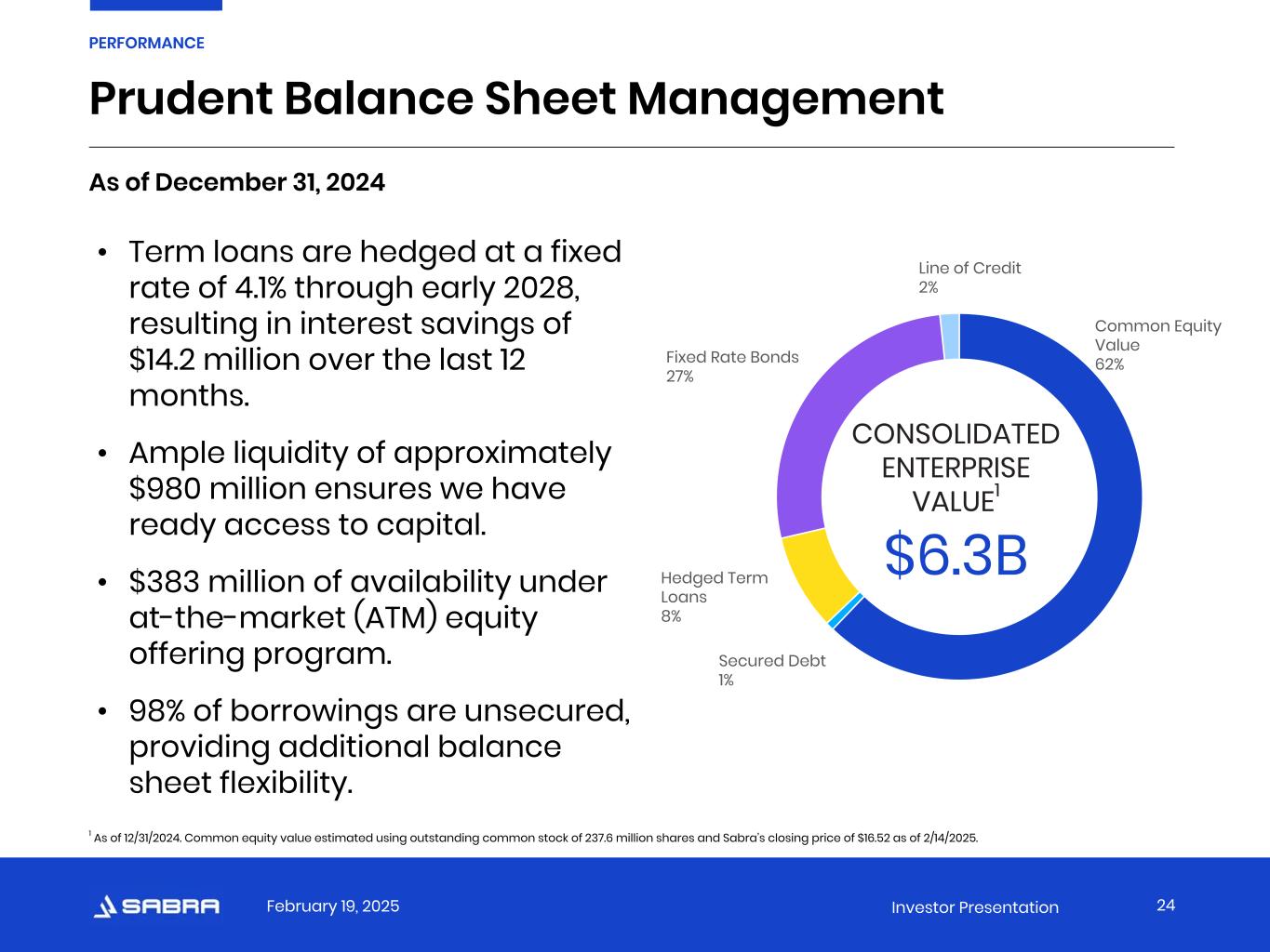 February 19, 2025 Investor Presentation Common Equity Value 62% Secured Debt 1% Hedged Term Loans 8% Fixed Rate Bonds 27% Line of Credit 2% Prudent Balance Sheet Management 1 As of 12/31/2024. Common equity value estimated using outstanding common stock of 237.6 million shares and Sabra’s closing price of $16.52 as of 2/14/2025. 24 PERFORMANCE • Term loans are hedged at a fixed rate of 4.1% through early 2028, resulting in interest savings of $14.2 million over the last 12 months. • Ample liquidity of approximately $980 million ensures we have ready access to capital. • $383 million of availability under at-the-market (ATM) equity offering program. • 98% of borrowings are unsecured, providing additional balance sheet flexibility. CONSOLIDATED ENTERPRISE VALUE1 $6.3B As of December 31, 2024