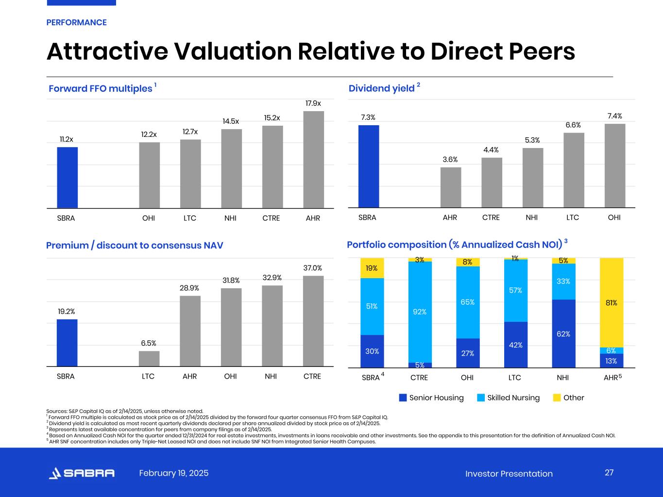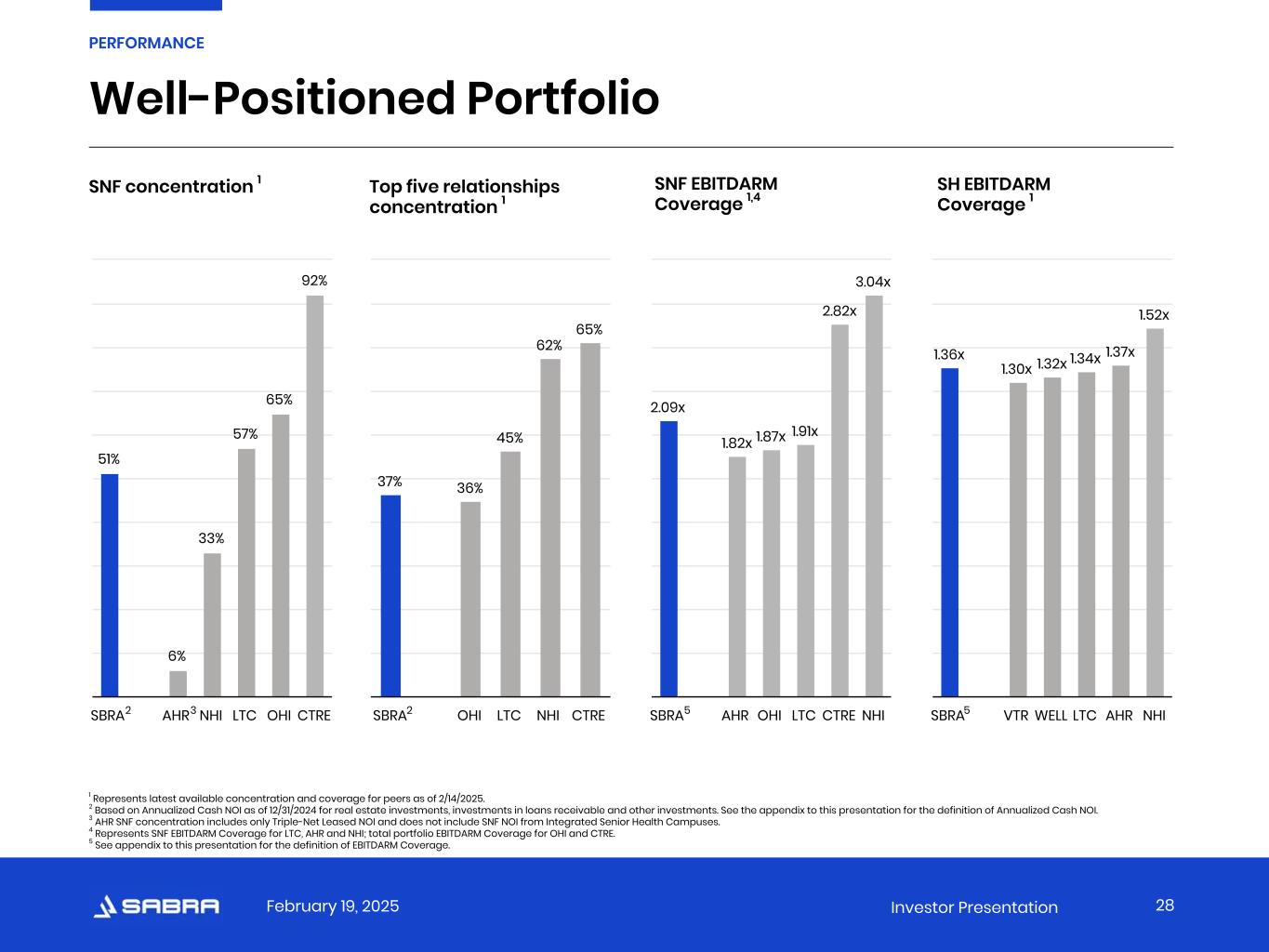 February 19, 2025 Investor Presentation Attractive Valuation Relative to Direct Peers Forward FFO multiples 1 Dividend yield 2 Premium / discount to consensus NAV Portfolio composition (% Annualized Cash NOI) 3 Sources: S&P Capital IQ as of 2/14/2025, unless otherwise noted. 1 Forward FFO multiple is calculated as stock price as of 2/14/2025 divided by the forward four quarter consensus FFO from S&P Capital IQ. 2 Dividend yield is calculated as most recent quarterly dividends declared per share annualized divided by stock price as of 2/14/2025. 3 Represents latest available concentration for peers from company filings as of 2/14/2025. 4 Based on Annualized Cash NOI for the quarter ended 12/31/2024 for real estate investments, investments in loans receivable and other investments. See the appendix to this presentation for the definition of Annualized Cash NOI. 5 AHR SNF concentration includes only Triple-Net Leased NOI and does not include SNF NOI from Integrated Senior Health Campuses. 27 PERFORMANCE 11.2x 12.2x 12.7x 14.5x 15.2x 17.9x SBRA OHI LTC NHI CTRE AHR 7.3% 3.6% 4.4% 5.3% 6.6% 7.4% SBRA AHR CTRE NHI LTC OHI 19.2% 6.5% 28.9% 31.8% 32.9% 37.0% SBRA LTC AHR OHI NHI CTRE 30% 5% 27% 42% 62% 13% 51% 92% 65% 57% 33% 6% 19% 3% 8% 1% 5% 81% Senior Housing Skilled Nursing Other SBRA CTRE OHI LTC NHI AHR4 5