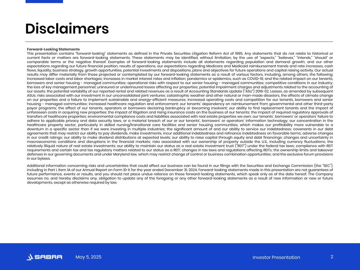 May 5, 2025 Investor Presentation Tenant and Borrower Information This presentation includes information (e.g., EBITDARM Coverage and Occupancy Percentage) regarding certain of our tenants that lease properties from us and our borrowers, most of which are not subject to SEC reporting requirements. The information related to our tenants and borrowers that is provided in this presentation has been provided by, or derived from information provided by, such tenants and borrowers. We have not independently verified this information. We have no reason to believe that such information is inaccurate in any material respect. We are providing this data for informational purposes only. Non-GAAP Financial Measures This presentation contains certain non-GAAP financial measures related to Sabra Health Care REIT, Inc., including Annualized Cash NOI, Net Debt to Adjusted EBITDA and funds from operations (FFO). These measures may be different than non-GAAP financial measures used by other companies, and the presentation of these measures is not intended to be considered in isolation or as a substitute for financial information prepared and presented in accordance with U.S. generally accepted accounting principles (GAAP). An explanation of these non-GAAP financial measures is included under “Definitions” in the Appendix, and reconciliations of these non-GAAP financial measures to the GAAP financial measures we consider most comparable are included on the Investors section of our website at https://ir.sabrahealth.com/investors/financials/quarterly-results. Disclaimers 3