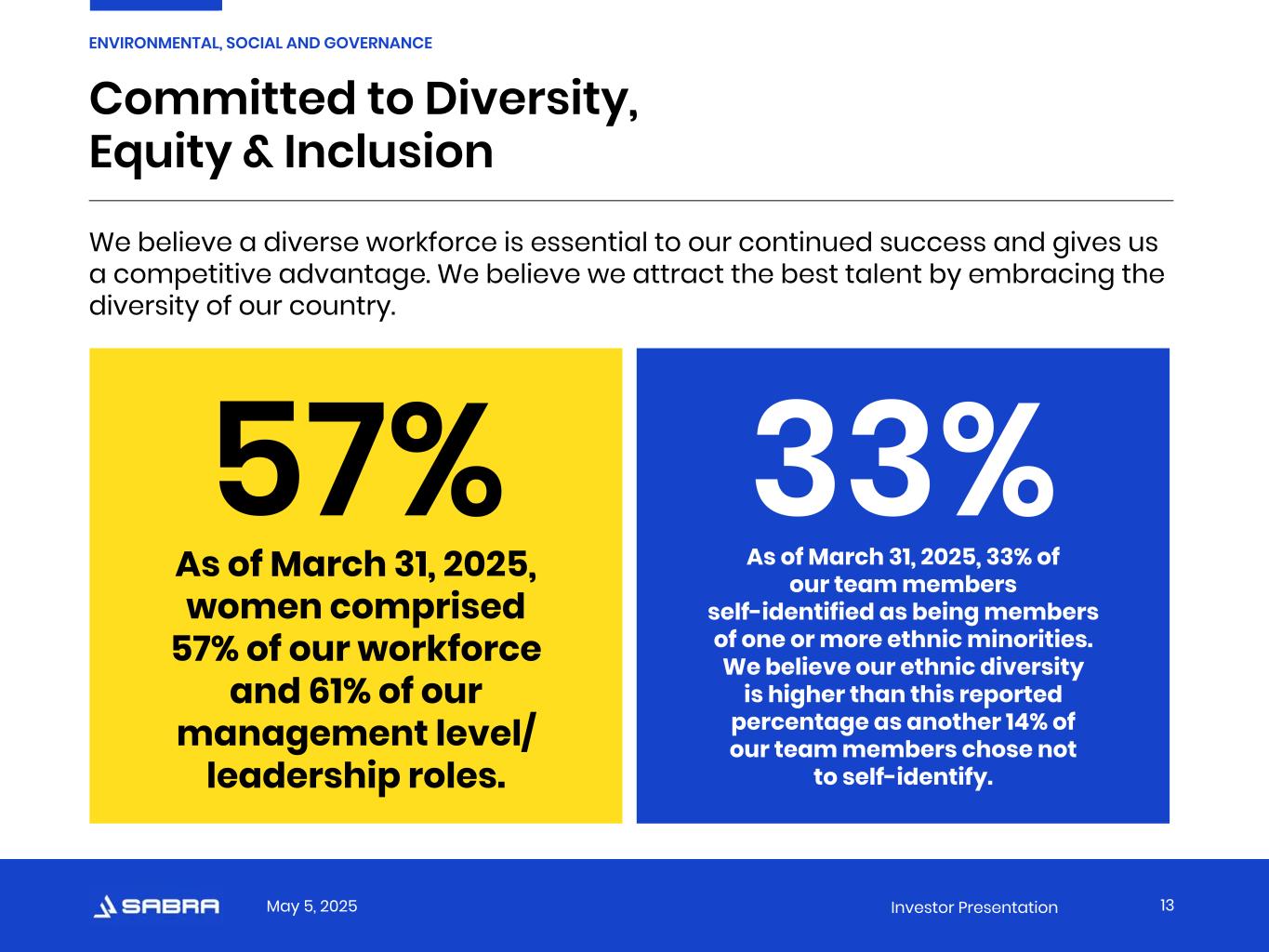 May 5, 2025 Investor Presentation Going the Extra Green Mile 12 ENVIRONMENTAL, SOCIAL AND GOVERNANCE At Gardens of Wakefield, Sabra and Holiday by Atria went the extra mile, bringing in Blue Sky E3 Partners, LLC and a team of Carrier engineers to help identify and design a custom, efficient solution for the community’s heating/ cooling system. Replacing the existing gas water heaters with a modern tankless system, Carrier could fit a SEER 21 HVAC inverter system, significantly improving efficiency by a combined 44%. Not only did it reduce operating expenses, but, more importantly, it positively improved the overall environment, the residents’ living environment, and the staff’s work environment - a win-win-win-win investment.