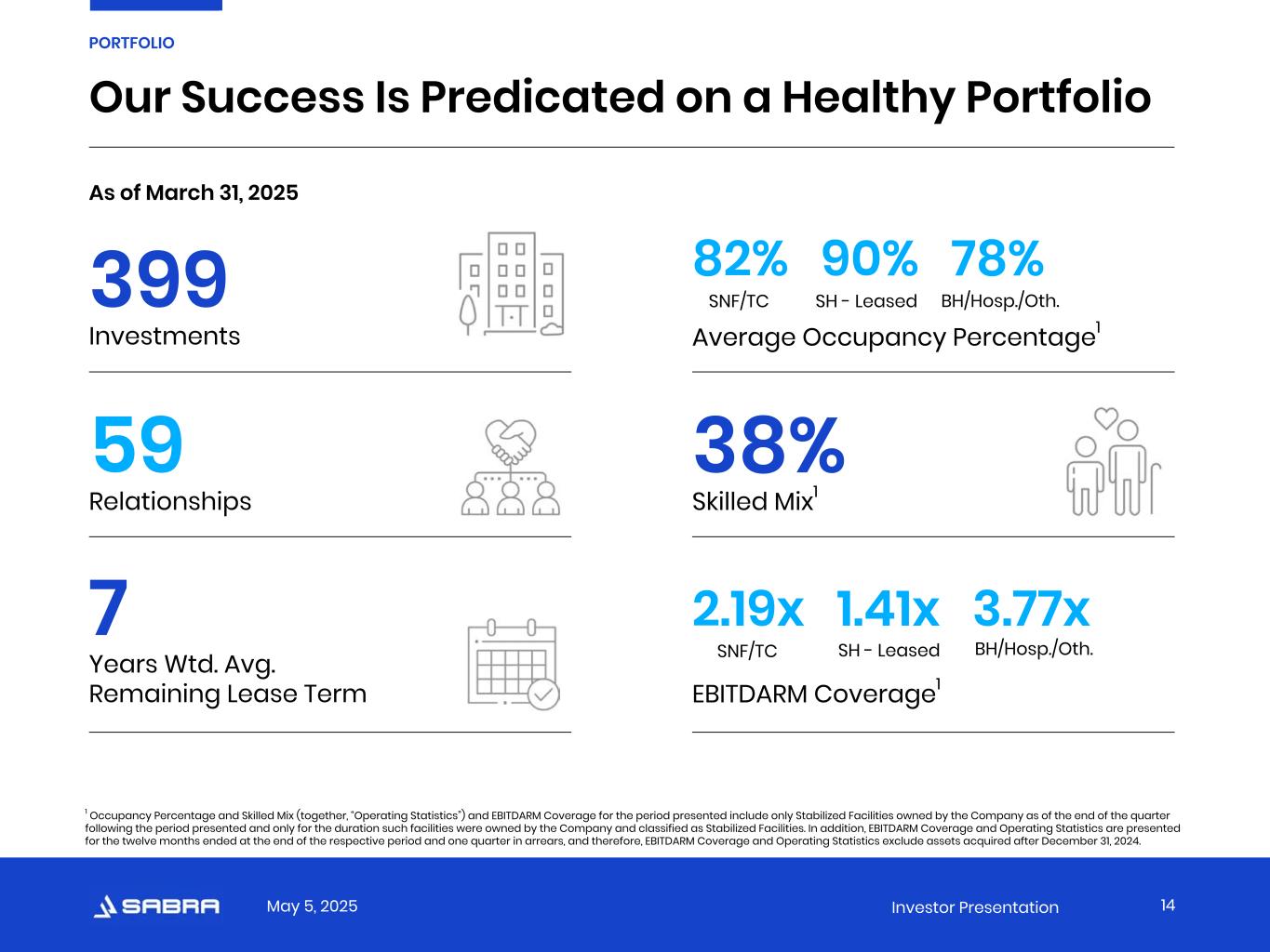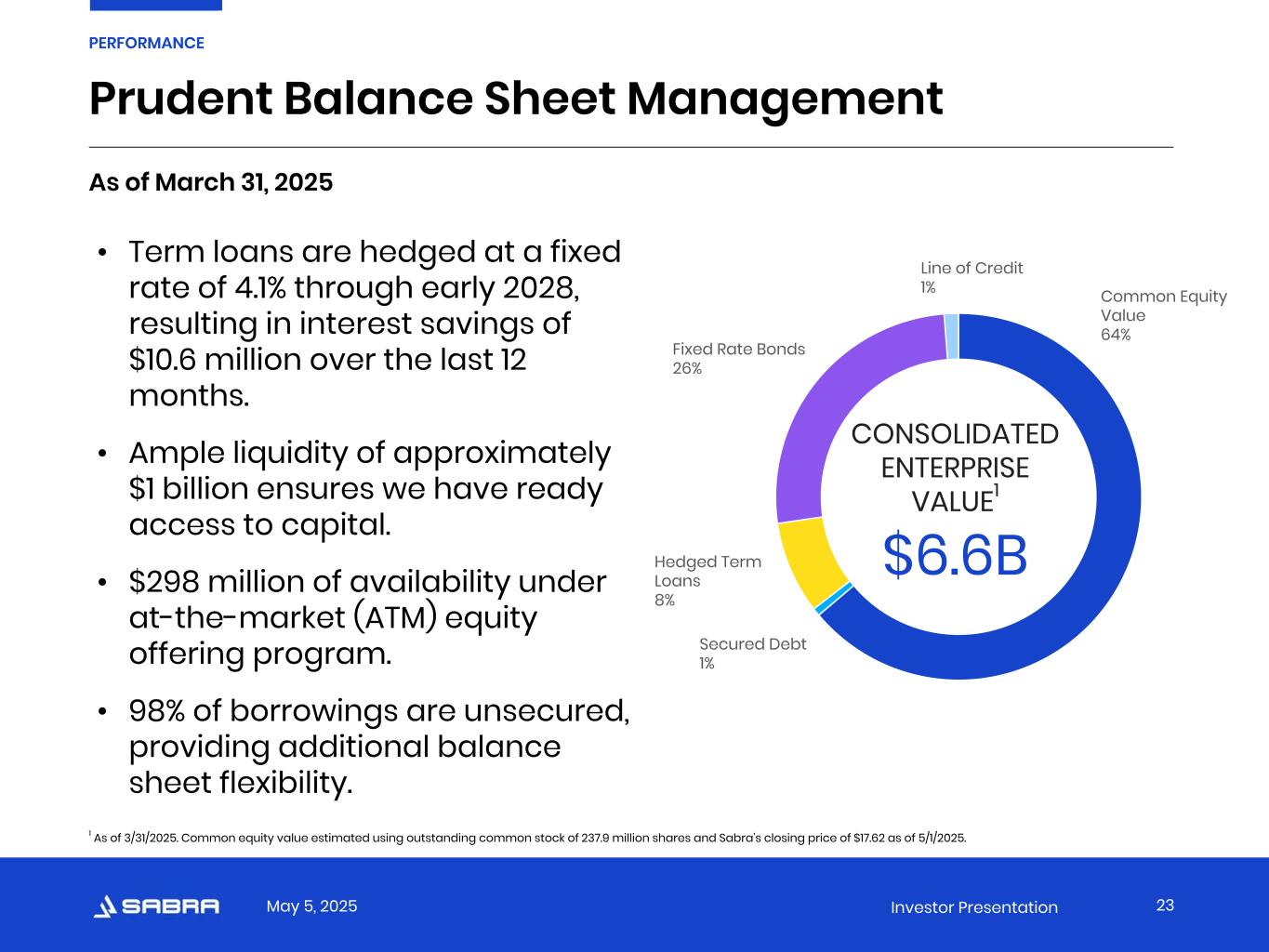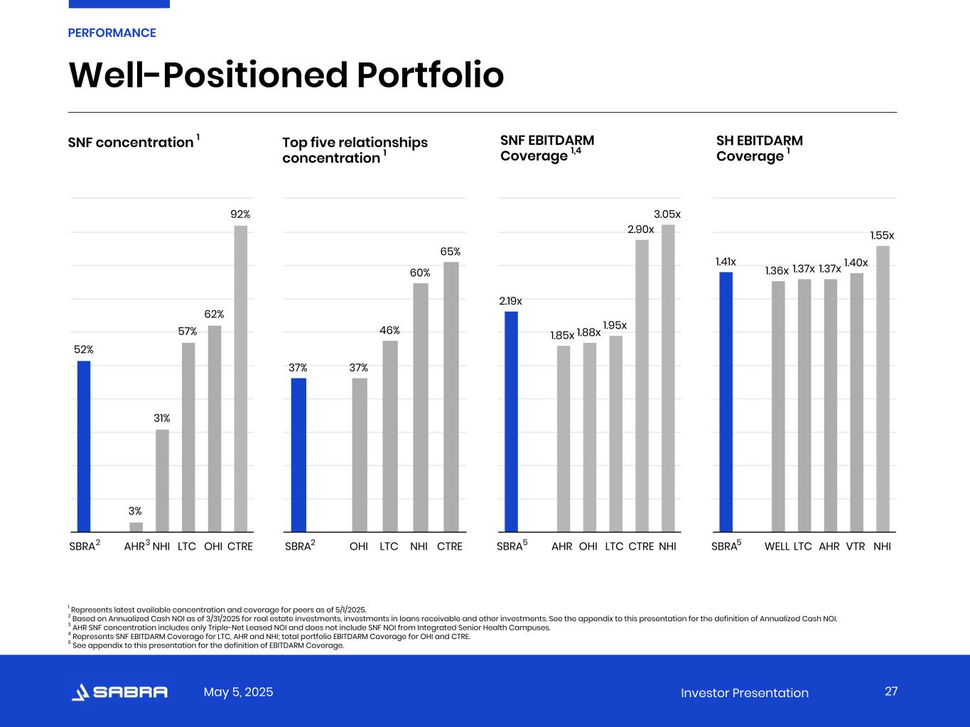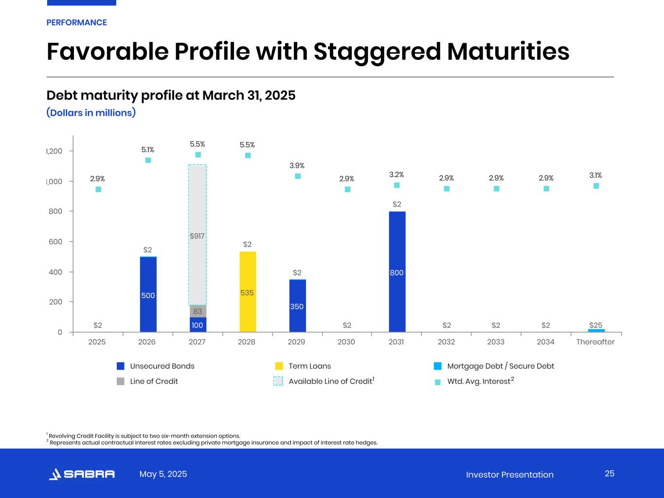 May 5, 2025 Investor Presentation   Sabra 1Q 25 1 Investment-Grade peers range 2 Net Debt to Adjusted EBITDA 5.19x 3 3.33x - 5.69x Interest Coverage Ratio 4.52x 4.10x - 6.38x Debt as a % of Asset Value 37% 25% - 39% Secured Debt as a % of Asset Value 1% 2% - 8% Investment-Grade Credit Metrics 1 Key credit statistics (except Net Debt to Adjusted EBITDA) are calculated in accordance with the credit agreement relating to the revolving credit facility and the indentures relating to our senior unsecured notes. In addition, key credit statistics give effect to dispositions and acquisitions completed after the period presented as though such dispositions and acquisitions occurred at the beginning of the period. 2 Investment-Grade Peers consists of WELL, VTR, OHI and NHI. The metrics used to calculate Investment-Grade peers range are sourced from the most recent public filings with the SEC and may not be calculated in a manner identical to Sabra’s metrics. 3 Based on the annualized trailing three-month period ended as of the date indicated. 24 PERFORMANCE We continue to focus on strengthening our balance sheet and portfolio.