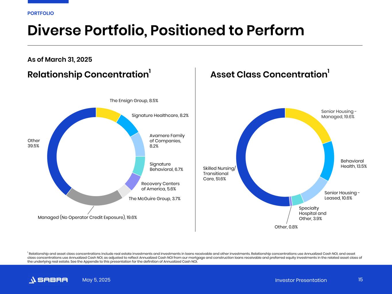 May 5, 2025 Investor Presentation Our Success Is Predicated on a Healthy Portfolio 1 Occupancy Percentage and Skilled Mix (together, “Operating Statistics”) and EBITDARM Coverage for the period presented include only Stabilized Facilities owned by the Company as of the end of the quarter following the period presented and only for the duration such facilities were owned by the Company and classified as Stabilized Facilities. In addition, EBITDARM Coverage and Operating Statistics are presented for the twelve months ended at the end of the respective period and one quarter in arrears, and therefore, EBITDARM Coverage and Operating Statistics exclude assets acquired after December 31, 2024. 7 Years Wtd. Avg. Remaining Lease Term 399 Investments 2.19x   1.41x   3.77x 59 Relationships 38% Skilled Mix1 Average Occupancy Percentage1 82%   90%   78% SH - LeasedSNF/TC SNF/TC SH - Leased EBITDARM Coverage1 As of March 31, 2025 BH/Hosp./Oth. BH/Hosp./Oth. 14 PORTFOLIO