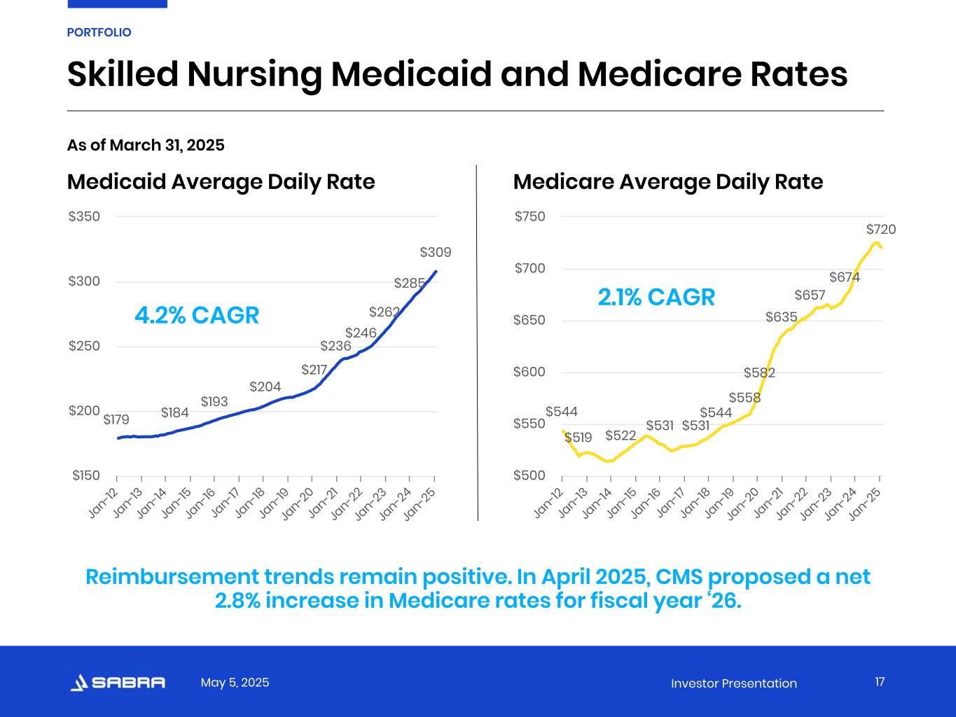 May 5, 2025 Investor Presentation Favorable Supply and Demand Trends 16 PORTFOLIO SNF Supply and Demand 1,795 1,769 1,744 1,716 1,704 1,703 1,703 1,694 1,690 1,687 1,639 1,617 1,581 4,296 4,512 4,783 5,121 5,444 5,753 5,905 6,166 6,380 6,539 6,483 6,486 6,859 SNF Beds (000s) Population 85 or older (000s) 2000 2001 2002 2003 2004 2005 2006 2007 2008 2009 2010 2011 2012 2013 2014 2015 2016 2017 2018 2019 2020 2021 2022 2023 2024 — 1,000 2,000 3,000 4,000 5,000 6,000 7,000 8,000 Source: Census.gov, AHCA, Care Compare Since 2000, the 85-or-older population has grown by 60%, compared to a 12% decline in skilled nursing beds over the same time frame.
