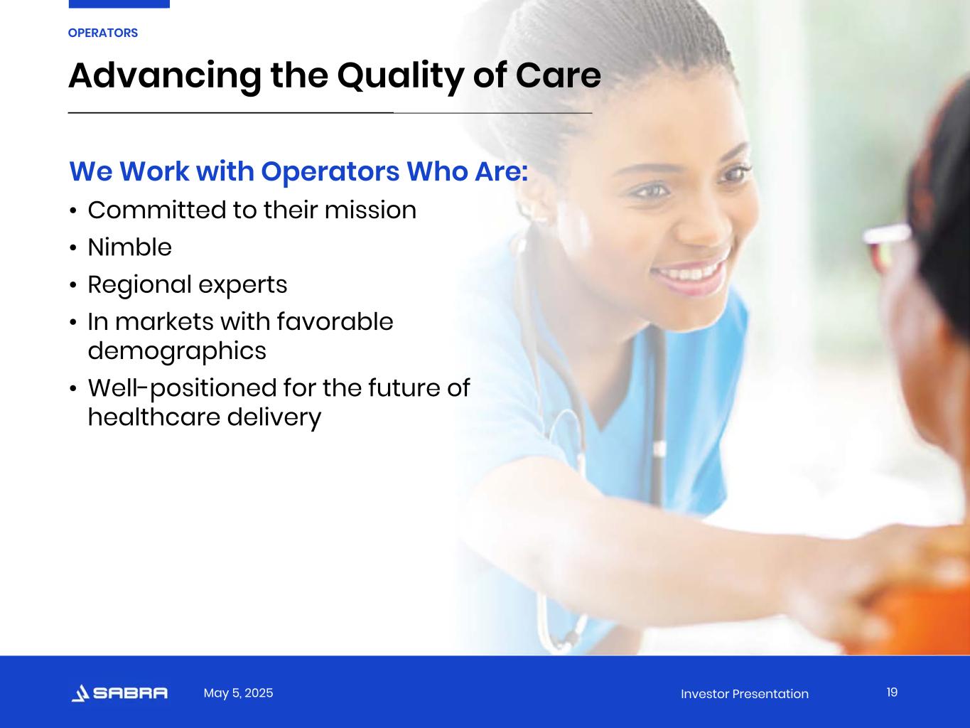 May 5, 2025 Investor Presentation “We invest in relationships with operators who are nimble and poised to deliver excellent care now and in the future.” -Peter Nyland, Executive Vice President, Asset Management 18 PORTFOLIO