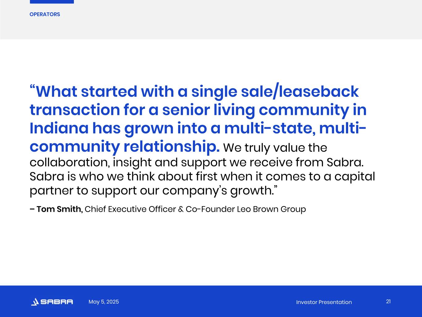 May 5, 2025 Investor Presentation “What started with a single sale/leaseback transaction for a senior living community in Indiana has grown into a multi-state, multi- community relationship. We truly value the collaboration, insight and support we receive from Sabra. Sabra is who we think about first when it comes to a capital partner to support our company’s growth.” – Tom Smith, Chief Executive Officer & Co-Founder Leo Brown Group 21 OPERATORS
