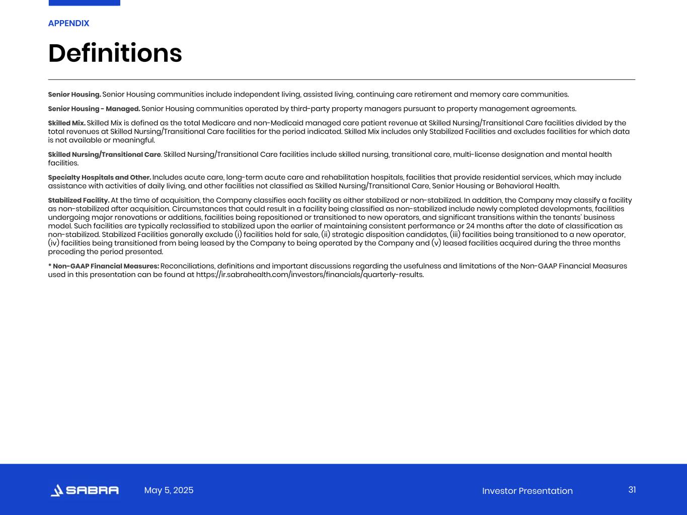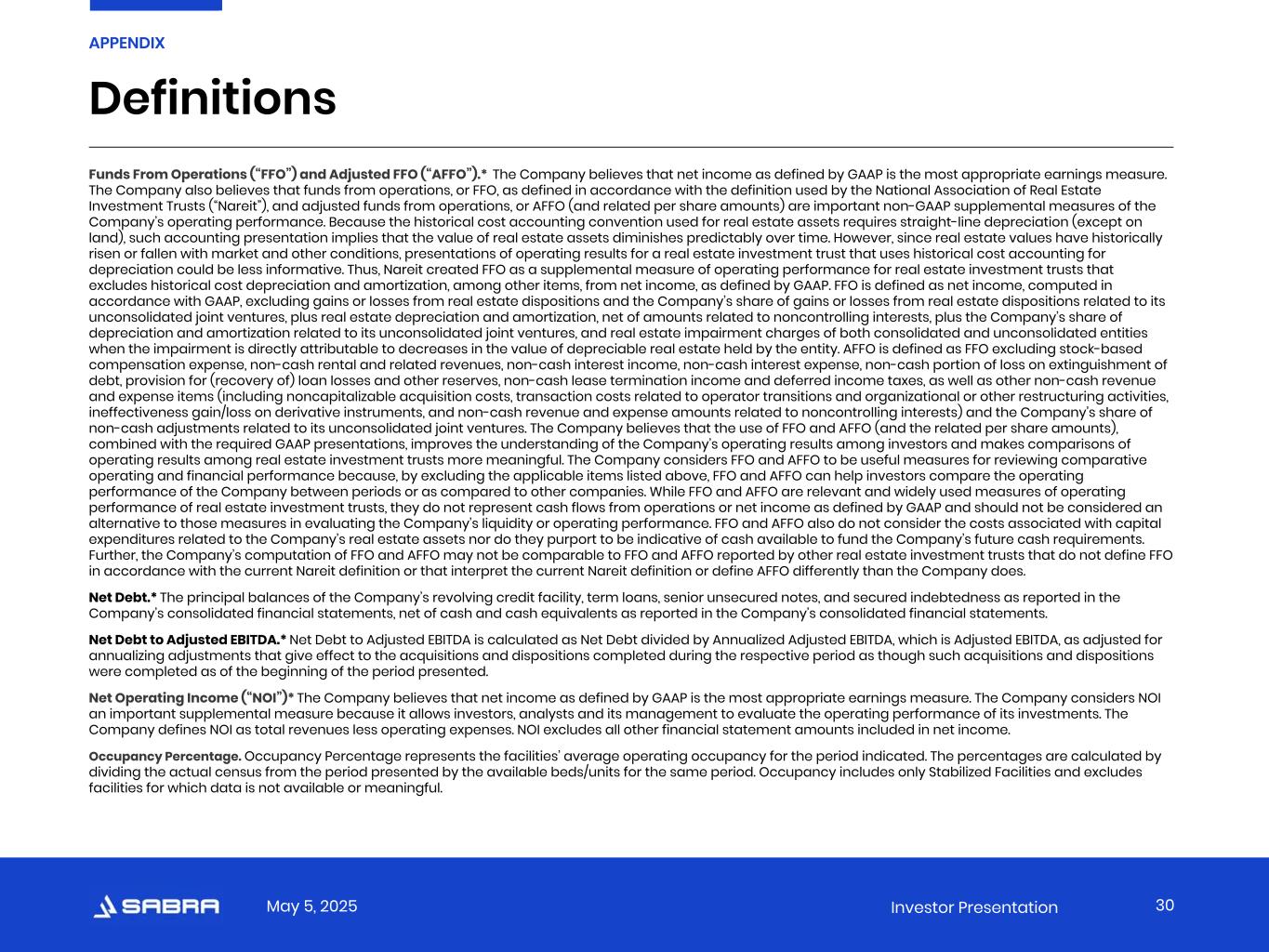May 5, 2025 Investor Presentation Funds From Operations (“FFO”) and Adjusted FFO (“AFFO”).*  The Company believes that net income as defined by GAAP is the most appropriate earnings measure. The Company also believes that funds from operations, or FFO, as defined in accordance with the definition used by the National Association of Real Estate Investment Trusts (“Nareit”), and adjusted funds from operations, or AFFO (and related per share amounts) are important non-GAAP supplemental measures of the Company’s operating performance. Because the historical cost accounting convention used for real estate assets requires straight-line depreciation (except on land), such accounting presentation implies that the value of real estate assets diminishes predictably over time. However, since real estate values have historically risen or fallen with market and other conditions, presentations of operating results for a real estate investment trust that uses historical cost accounting for depreciation could be less informative. Thus, Nareit created FFO as a supplemental measure of operating performance for real estate investment trusts that excludes historical cost depreciation and amortization, among other items, from net income, as defined by GAAP. FFO is defined as net income, computed in accordance with GAAP, excluding gains or losses from real estate dispositions and the Company’s share of gains or losses from real estate dispositions related to its unconsolidated joint ventures, plus real estate depreciation and amortization, net of amounts related to noncontrolling interests, plus the Company’s share of depreciation and amortization related to its unconsolidated joint ventures, and real estate impairment charges of both consolidated and unconsolidated entities when the impairment is directly attributable to decreases in the value of depreciable real estate held by the entity. AFFO is defined as FFO excluding stock-based compensation expense, non-cash rental and related revenues, non-cash interest income, non-cash interest expense, non-cash portion of loss on extinguishment of debt, provision for (recovery of) loan losses and other reserves, non-cash lease termination income and deferred income taxes, as well as other non-cash revenue and expense items (including noncapitalizable acquisition costs, transaction costs related to operator transitions and organizational or other restructuring activities, ineffectiveness gain/loss on derivative instruments, and non-cash revenue and expense amounts related to noncontrolling interests) and the Company’s share of non-cash adjustments related to its unconsolidated joint ventures. The Company believes that the use of FFO and AFFO (and the related per share amounts), combined with the required GAAP presentations, improves the understanding of the Company’s operating results among investors and makes comparisons of operating results among real estate investment trusts more meaningful. The Company considers FFO and AFFO to be useful measures for reviewing comparative operating and financial performance because, by excluding the applicable items listed above, FFO and AFFO can help investors compare the operating performance of the Company between periods or as compared to other companies. While FFO and AFFO are relevant and widely used measures of operating performance of real estate investment trusts, they do not represent cash flows from operations or net income as defined by GAAP and should not be considered an alternative to those measures in evaluating the Company’s liquidity or operating performance. FFO and AFFO also do not consider the costs associated with capital expenditures related to the Company’s real estate assets nor do they purport to be indicative of cash available to fund the Company’s future cash requirements. Further, the Company’s computation of FFO and AFFO may not be comparable to FFO and AFFO reported by other real estate investment trusts that do not define FFO in accordance with the current Nareit definition or that interpret the current Nareit definition or define AFFO differently than the Company does. Net Debt.* The principal balances of the Company’s revolving credit facility, term loans, senior unsecured notes, and secured indebtedness as reported in the Company’s consolidated financial statements, net of cash and cash equivalents as reported in the Company’s consolidated financial statements. Net Debt to Adjusted EBITDA.* Net Debt to Adjusted EBITDA is calculated as Net Debt divided by Annualized Adjusted EBITDA, which is Adjusted EBITDA, as adjusted for annualizing adjustments that give effect to the acquisitions and dispositions completed during the respective period as though such acquisitions and dispositions were completed as of the beginning of the period presented. Net Operating Income (“NOI”)* The Company believes that net income as defined by GAAP is the most appropriate earnings measure. The Company considers NOI an important supplemental measure because it allows investors, analysts and its management to evaluate the operating performance of its investments. The Company defines NOI as total revenues less operating expenses. NOI excludes all other financial statement amounts included in net income. Occupancy Percentage. Occupancy Percentage represents the facilities’ average operating occupancy for the period indicated. The percentages are calculated by dividing the actual census from the period presented by the available beds/units for the same period. Occupancy includes only Stabilized Facilities and excludes facilities for which data is not available or meaningful. Definitions 30 APPENDIX