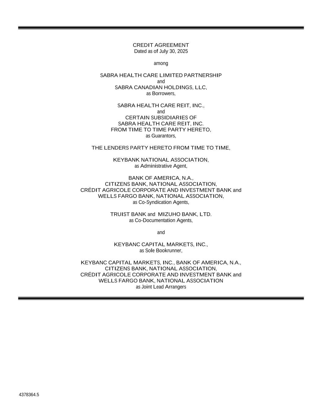 4378364.5 CREDIT AGREEMENT Dated as of July 30, 2025 among SABRA HEALTH CARE LIMITED PARTNERSHIP and SABRA CANADIAN HOLDINGS, LLC, as Borrowers, SABRA HEALTH CARE REIT, INC., and CERTAIN SUBSIDIARIES OF SABRA HEALTH CARE REIT, INC. FROM TIME TO TIME PARTY HERETO, as Guarantors, THE LENDERS PARTY HERETO FROM TIME TO TIME, KEYBANK NATIONAL ASSOCIATION, as Administrative Agent, BANK OF AMERICA, N.A., CITIZENS BANK, NATIONAL ASSOCIATION, CRÉDIT AGRICOLE CORPORATE AND INVESTMENT BANK and WELLS FARGO BANK, NATIONAL ASSOCIATION, as Co-Syndication Agents, TRUIST BANK and MIZUHO BANK, LTD. as Co-Documentation Agents, and KEYBANC CAPITAL MARKETS, INC., as Sole Bookrunner, KEYBANC CAPITAL MARKETS, INC., BANK OF AMERICA, N.A., CITIZENS BANK, NATIONAL ASSOCIATION, CRÉDIT AGRICOLE CORPORATE AND INVESTMENT BANK and WELLS FARGO BANK, NATIONAL ASSOCIATION as Joint Lead Arrangers