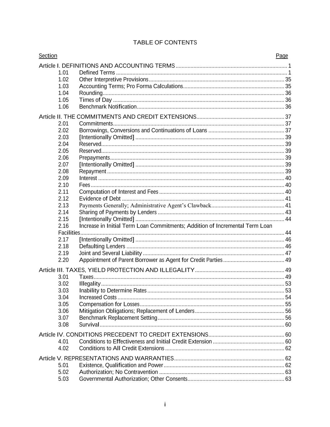 i TABLE OF CONTENTS Section Page Article I. DEFINITIONS AND ACCOUNTING TERMS ........................................................................... 1 1.01 Defined Terms ................................................................................................................... 1 1.02 Other Interpretive Provisions ........................................................................................... 35 1.03 Accounting Terms; Pro Forma Calculations .................................................................... 35 1.04 Rounding. ......................................................................................................................... 36 1.05 Times of Day ................................................................................................................... 36 1.06 Benchmark Notification ................................................................................................... 36 Article II. THE COMMITMENTS AND CREDIT EXTENSIONS........................................................... 37 2.01 Commitments ................................................................................................................... 37 2.02 Borrowings, Conversions and Continuations of Loans ................................................... 37 2.03 [Intentionally Omitted] .................................................................................................... 39 2.04 Reserved........................................................................................................................... 39 2.05 Reserved........................................................................................................................... 39 2.06 Prepayments ..................................................................................................................... 39 2.07 [Intentionally Omitted] .................................................................................................... 39 2.08 Repayment ....................................................................................................................... 39 2.09 Interest ............................................................................................................................. 40 2.10 Fees .................................................................................................................................. 40 2.11 Computation of Interest and Fees .................................................................................... 40 2.12 Evidence of Debt ............................................................................................................. 41 2.13 Payments Generally; Administrative Agent’s Clawback ................................................. 41 2.14 Sharing of Payments by Lenders ..................................................................................... 43 2.15 [Intentionally Omitted] .................................................................................................... 44 2.16 Increase in Initial Term Loan Commitments; Addition of Incremental Term Loan Facilities ......................................................................................................................................... 44 2.17 [Intentionally Omitted] .................................................................................................... 46 2.18 Defaulting Lenders .......................................................................................................... 46 2.19 Joint and Several Liability ............................................................................................... 47 2.20 Appointment of Parent Borrower as Agent for Credit Parties ......................................... 49 Article III. TAXES, YIELD PROTECTION AND ILLEGALITY ............................................................ 49 3.01 Taxes ................................................................................................................................ 49 3.02 Illegality ........................................................................................................................... 53 3.03 Inability to Determine Rates ............................................................................................ 53 3.04 Increased Costs ................................................................................................................ 54 3.05 Compensation for Losses ................................................................................................. 55 3.06 Mitigation Obligations; Replacement of Lenders ............................................................ 56 3.07 Benchmark Replacement Setting ..................................................................................... 56 3.08 Survival ............................................................................................................................ 60 Article IV. CONDITIONS PRECEDENT TO CREDIT EXTENSIONS................................................... 60 4.01 Conditions to Effectiveness and Initial Credit Extension ................................................ 60 4.02 Conditions to All Credit Extensions ................................................................................ 62 Article V. REPRESENTATIONS AND WARRANTIES .......................................................................... 62 5.01 Existence, Qualification and Power ................................................................................. 62 5.02 Authorization; No Contravention .................................................................................... 63 5.03 Governmental Authorization; Other Consents ................................................................. 63
