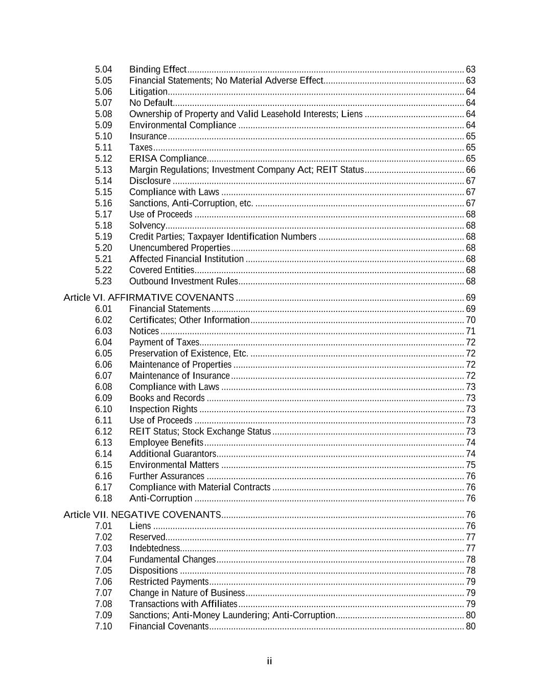 ii 5.04 Binding Effect .................................................................................................................. 63 5.05 Financial Statements; No Material Adverse Effect.......................................................... 63 5.06 Litigation .......................................................................................................................... 64 5.07 No Default........................................................................................................................ 64 5.08 Ownership of Property and Valid Leasehold Interests; Liens ......................................... 64 5.09 Environmental Compliance ............................................................................................. 64 5.10 Insurance .......................................................................................................................... 65 5.11 Taxes ................................................................................................................................ 65 5.12 ERISA Compliance .......................................................................................................... 65 5.13 Margin Regulations; Investment Company Act; REIT Status ......................................... 66 5.14 Disclosure ........................................................................................................................ 67 5.15 Compliance with Laws .................................................................................................... 67 5.16 Sanctions, Anti-Corruption, etc. ...................................................................................... 67 5.17 Use of Proceeds ............................................................................................................... 68 5.18 Solvency........................................................................................................................... 68 5.19 Credit Parties; Taxpayer Identification Numbers ............................................................ 68 5.20 Unencumbered Properties ................................................................................................ 68 5.21 Affected Financial Institution .......................................................................................... 68 5.22 Covered Entities ............................................................................................................... 68 5.23 Outbound Investment Rules ............................................................................................. 68 Article VI. AFFIRMATIVE COVENANTS .............................................................................................. 69 6.01 Financial Statements ........................................................................................................ 69 6.02 Certificates; Other Information ........................................................................................ 70 6.03 Notices ............................................................................................................................. 71 6.04 Payment of Taxes ............................................................................................................. 72 6.05 Preservation of Existence, Etc. ........................................................................................ 72 6.06 Maintenance of Properties ............................................................................................... 72 6.07 Maintenance of Insurance ................................................................................................ 72 6.08 Compliance with Laws .................................................................................................... 73 6.09 Books and Records .......................................................................................................... 73 6.10 Inspection Rights ............................................................................................................. 73 6.11 Use of Proceeds ............................................................................................................... 73 6.12 REIT Status; Stock Exchange Status ............................................................................... 73 6.13 Employee Benefits ........................................................................................................... 74 6.14 Additional Guarantors ...................................................................................................... 74 6.15 Environmental Matters .................................................................................................... 75 6.16 Further Assurances .......................................................................................................... 76 6.17 Compliance with Material Contracts ............................................................................... 76 6.18 Anti-Corruption ............................................................................................................... 76 Article VII. NEGATIVE COVENANTS .................................................................................................... 76 7.01 Liens ................................................................................................................................ 76 7.02 Reserved........................................................................................................................... 77 7.03 Indebtedness..................................................................................................................... 77 7.04 Fundamental Changes ...................................................................................................... 78 7.05 Dispositions ..................................................................................................................... 78 7.06 Restricted Payments ............................