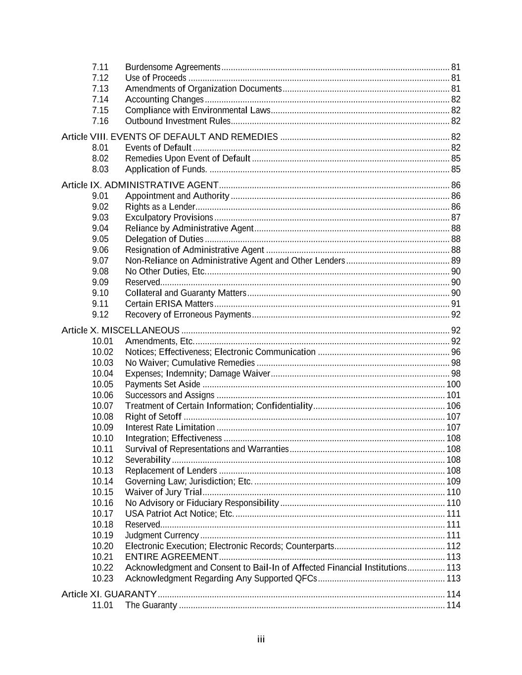 iii 7.11 Burdensome Agreements ................................................................................................. 81 7.12 Use of Proceeds ............................................................................................................... 81 7.13 Amendments of Organization Documents ....................................................................... 81 7.14 Accounting Changes ........................................................................................................ 82 7.15 Compliance with Environmental Laws ............................................................................ 82 7.16 Outbound Investment Rules ............................................................................................. 82 Article VIII. EVENTS OF DEFAULT AND REMEDIES ........................................................................ 82 8.01 Events of Default ............................................................................................................. 82 8.02 Remedies Upon Event of Default .................................................................................... 85 8.03 Application of Funds. ...................................................................................................... 85 Article IX. ADMINISTRATIVE AGENT .................................................................................................. 86 9.01 Appointment and Authority ............................................................................................. 86 9.02 Rights as a Lender ............................................................................................................ 86 9.03 Exculpatory Provisions .................................................................................................... 87 9.04 Reliance by Administrative Agent ................................................................................... 88 9.05 Delegation of Duties ........................................................................................................ 88 9.06 Resignation of Administrative Agent .............................................................................. 88 9.07 Non-Reliance on Administrative Agent and Other Lenders ............................................ 89 9.08 No Other Duties, Etc. ....................................................................................................... 90 9.09 Reserved........................................................................................................................... 90 9.10 Collateral and Guaranty Matters ...................................................................................... 90 9.11 Certain ERISA Matters .................................................................................................... 91 9.12 Recovery of Erroneous Payments .................................................................................... 92 Article X. MISCELLANEOUS .................................................................................................................. 92 10.01 Amendments, Etc. ............................................................................................................ 92 10.02 Notices; Effectiveness; Electronic Communication ........................................................ 96 10.03 No Waiver; Cumulative Remedies .................................................................................. 98 10.04 Expenses; Indemnity; Damage Waiver ............................................................................ 98 10.05 Payments Set Aside ....................................................................................................... 100 10.06 Successors and Assigns ................................................................................................. 101 10.07 Treatment of Certain Information; Confidentiality ........................................................ 106 10.08 Right of Setoff ............................................................................................................... 107 10.09 Interest Rate Limitation ................................................................................................. 107 10.10 Integration; Effectiveness .............................................................................................. 108 10.11 Survival of Representations and Warranties .................................................................. 108 10.12 Severability .................................................................................................................... 108 10.13 Replacement of Lenders ................................................................................................ 108 10.14 Governing Law; Jurisdiction; Etc. ................................................................................. 109 10.15 Waiver of Jury Trial ....................................................................................................... 110 10.16 No Advisory or Fiduciary Responsibility ...................................................................... 110 10.17 USA Patriot Act Notice; Etc. ......................................................................................... 111 10.18 Reserved......................................................................................................................... 111 10.19 Judgment Currency ........................................................................................................ 111 10.20 Electronic Execution; Electronic Records; Counterparts ............................................... 112 10.21 ENTIRE AGREEMENT ................................................................................................ 113 10.22 Acknowledgment and Consent to Bail-In of Affected Financial Institutions ................ 113 10.23 Acknowledgment Regarding Any Supported QFCs ...................................................... 113 Art