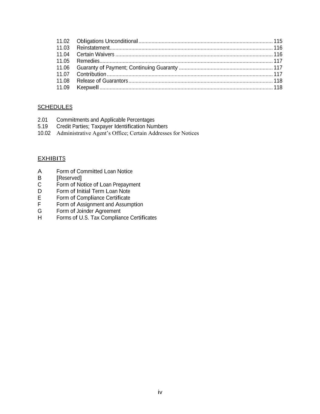 iv 11.02 Obligations Unconditional ............................................................................................. 115 11.03 Reinstatement ................................................................................................................. 116 11.04 Certain Waivers ............................................................................................................. 116 11.05 Remedies ........................................................................................................................ 117 11.06 Guaranty of Payment; Continuing Guaranty ................................................................. 117 11.07 Contribution ................................................................................................................... 117 11.08 Release of Guarantors .................................................................................................... 118 11.09 Keepwell ........................................................................................................................ 118 SCHEDULES 2.01 Commitments and Applicable Percentages 5.19 Credit Parties; Taxpayer Identification Numbers 10.02 Administrative Agent’s Office; Certain Addresses for Notices EXHIBITS A Form of Committed Loan Notice B [Reserved] C Form of Notice of Loan Prepayment D Form of Initial Term Loan Note E Form of Compliance Certificate F Form of Assignment and Assumption G Form of Joinder Agreement H Forms of U.S. Tax Compliance Certificates