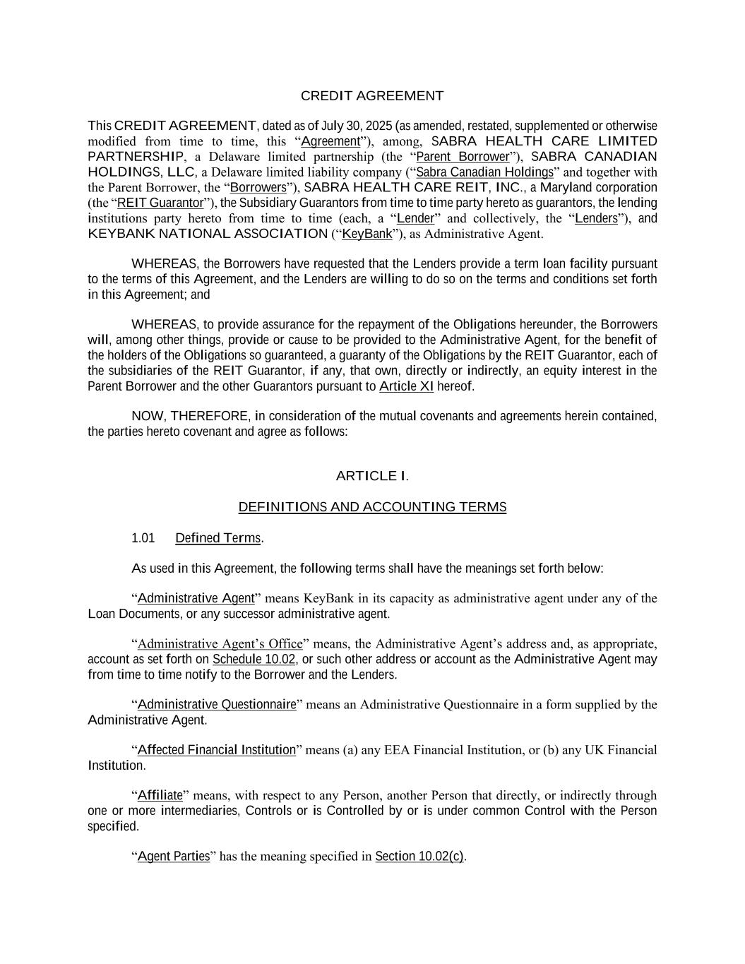 CREDIT AGREEMENT This CREDIT AGREEMENT, dated as of July 30, 2025 (as amended, restated, supplemented or otherwise modified from time to time, this “Agreement”), among, SABRA HEALTH CARE LIMITED PARTNERSHIP, a Delaware limited partnership (the “Parent Borrower”), SABRA CANADIAN HOLDINGS, LLC, a Delaware limited liability company (“Sabra Canadian Holdings” and together with the Parent Borrower, the “Borrowers”), SABRA HEALTH CARE REIT, INC., a Maryland corporation (the “REIT Guarantor”), the Subsidiary Guarantors from time to time party hereto as guarantors, the lending institutions party hereto from time to time (each, a “Lender” and collectively, the “Lenders”), and KEYBANK NATIONAL ASSOCIATION (“KeyBank”), as Administrative Agent. WHEREAS, the Borrowers have requested that the Lenders provide a term loan facility pursuant to the terms of this Agreement, and the Lenders are willing to do so on the terms and conditions set forth in this Agreement; and WHEREAS, to provide assurance for the repayment of the Obligations hereunder, the Borrowers will, among other things, provide or cause to be provided to the Administrative Agent, for the benefit of the holders of the Obligations so guaranteed, a guaranty of the Obligations by the REIT Guarantor, each of the subsidiaries of the REIT Guarantor, if any, that own, directly or indirectly, an equity interest in the Parent Borrower and the other Guarantors pursuant to Article XI hereof. NOW, THEREFORE, in consideration of the mutual covenants and agreements herein contained, the parties hereto covenant and agree as follows: ARTICLE I. DEFINITIONS AND ACCOUNTING TERMS 1.01 Defined Terms. As used in this Agreement, the following terms shall have the meanings set forth below: “Administrative Agent” means KeyBank in its capacity as administrative agent under any of the Loan Documents, or any successor administrative agent. “Administrative Agent’s Office” means, the Administrative Agent’s address and, as appropriate, account as set forth on Schedule 10.02, or such other address or account as the Administrative Agent may from time to time notify to the Borrower and the Lenders. “Administrative Questionnaire” means an Administrative Questionnaire in a form supplied by the Administrative Agent. “Affected Financial Institution” means (a) any EEA Financial Institution, or (b) any UK Financial Institution. “Affiliate” means, with respect to any Person, another Person that directly, or indirectly through one or more intermediaries, Controls or is Controlled by or is under common Control with the Person specified. “Agent Parties” has the meaning specified in Section 10.02(c).
