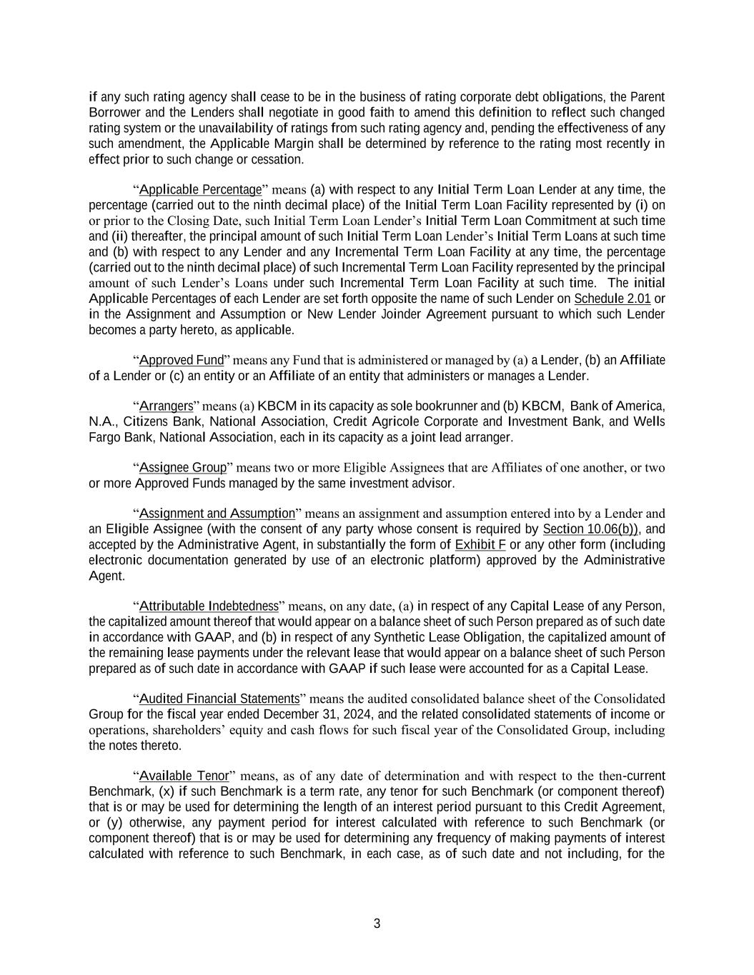 3 if any such rating agency shall cease to be in the business of rating corporate debt obligations, the Parent Borrower and the Lenders shall negotiate in good faith to amend this definition to reflect such changed rating system or the unavailability of ratings from such rating agency and, pending the effectiveness of any such amendment, the Applicable Margin shall be determined by reference to the rating most recently in effect prior to such change or cessation. “Applicable Percentage” means (a) with respect to any Initial Term Loan Lender at any time, the percentage (carried out to the ninth decimal place) of the Initial Term Loan Facility represented by (i) on or prior to the Closing Date, such Initial Term Loan Lender’s Initial Term Loan Commitment at such time and (ii) thereafter, the principal amount of such Initial Term Loan Lender’s Initial Term Loans at such time and (b) with respect to any Lender and any Incremental Term Loan Facility at any time, the percentage (carried out to the ninth decimal place) of such Incremental Term Loan Facility represented by the principal amount of such Lender’s Loans under such Incremental Term Loan Facility at such time. The initial Applicable Percentages of each Lender are set forth opposite the name of such Lender on Schedule 2.01 or in the Assignment and Assumption or New Lender Joinder Agreement pursuant to which such Lender becomes a party hereto, as applicable. “Approved Fund” means any Fund that is administered or managed by (a) a Lender, (b) an Affiliate of a Lender or (c) an entity or an Affiliate of an entity that administers or manages a Lender. “Arrangers” means (a) KBCM in its capacity as sole bookrunner and (b) KBCM, Bank of America, N.A., Citizens Bank, National Association, Credit Agricole Corporate and Investment Bank, and Wells Fargo Bank, National Association, each in its capacity as a joint lead arranger. “Assignee Group” means two or more Eligible Assignees that are Affiliates of one another, or two or more Approved Funds managed by the same investment advisor. “Assignment and Assumption” means an assignment and assumption entered into by a Lender and an Eligible Assignee (with the consent of any party whose consent is required by Section 10.06(b)), and accepted by the Administrative Agent, in substantially the form of Exhibit F or any other form (including electronic documentation generated by use of an electronic platform) approved by the Administrative Agent. “Attributable Indebtedness” means, on any date, (a) in respect of any Capital Lease of any Person, the capitalized amount thereof that would appear on a balance sheet of such Person prepared as of such date in accordance with GAAP, and (b) in respect of any Synthetic Lease Obligation, the capitalized amount of the remaining lease payments under the relevant lease that would appear on a balance sheet of such Person prepared as of such date in accordance with GAAP if such lease were accounted for as a Capital Lease. “Audited Financial Statements” means the audited consolidated balance sheet of the Consolidated Group for the fiscal year ended December 31, 2024, and the related consolidated statements of income or operations, shareholders’ equity and cash flows for such fiscal year of the Consolidated Group, including the notes thereto. “Available Tenor” means, as of any date of determination and with respect to the then-current Benchmark, (x) if such Benchmark is a term rate, any tenor for such Benchmark (or component thereof) that is or may be used for determining the length of an interest period pursuant to this Credit Agreement, or (y) otherwise, any payment period for interest calculated with reference to such Benchmark (or component thereof) that is or may be used for determining any frequency of making payments of interest calculated with reference to such Benchmark, in each case, as of such date and not including, for the