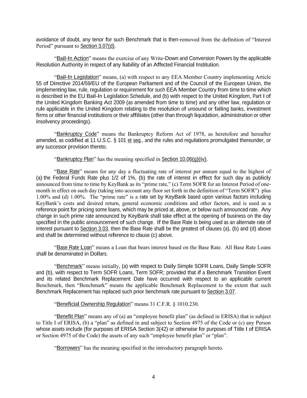4 avoidance of doubt, any tenor for such Benchmark that is then-removed from the definition of “Interest Period” pursuant to Section 3.07(d). “Bail-In Action” means the exercise of any Write-Down and Conversion Powers by the applicable Resolution Authority in respect of any liability of an Affected Financial Institution. “Bail-In Legislation” means, (a) with respect to any EEA Member Country implementing Article 55 of Directive 2014/59/EU of the European Parliament and of the Council of the European Union, the implementing law, rule, regulation or requirement for such EEA Member Country from time to time which is described in the EU Bail-In Legislation Schedule, and (b) with respect to the United Kingdom, Part I of the United Kingdom Banking Act 2009 (as amended from time to time) and any other law, regulation or rule applicable in the United Kingdom relating to the resolution of unsound or failing banks, investment firms or other financial institutions or their affiliates (other than through liquidation, administration or other insolvency proceedings). “Bankruptcy Code” means the Bankruptcy Reform Act of 1978, as heretofore and hereafter amended, as codified at 11 U.S.C. § 101 et seq., and the rules and regulations promulgated thereunder, or any successor provision thereto. “Bankruptcy Plan” has the meaning specified in Section 10.06(g)(iv). “Base Rate” means for any day a fluctuating rate of interest per annum equal to the highest of (a) the Federal Funds Rate plus 1/2 of 1%, (b) the rate of interest in effect for such day as publicly announced from time to time by KeyBank as its “prime rate,” (c) Term SOFR for an Interest Period of one- month in effect on such day (taking into account any floor set forth in the definition of “Term SOFR”) plus 1.00% and (d) 1.00%. The “prime rate” is a rate set by KeyBank based upon various factors including KeyBank’s costs and desired return, general economic conditions and other factors, and is used as a reference point for pricing some loans, which may be priced at, above, or below such announced rate. Any change in such prime rate announced by KeyBank shall take effect at the opening of business on the day specified in the public announcement of such change. If the Base Rate is being used as an alternate rate of interest pursuant to Section 3.03, then the Base Rate shall be the greatest of clauses (a), (b) and (d) above and shall be determined without reference to clause (c) above. “Base Rate Loan” means a Loan that bears interest based on the Base Rate. All Base Rate Loans shall be denominated in Dollars. “Benchmark” means initially, (a) with respect to Daily Simple SOFR Loans, Daily Simple SOFR and (b), with respect to Term SOFR Loans, Term SOFR; provided that if a Benchmark Transition Event and its related Benchmark Replacement Date have occurred with respect to an applicable current Benchmark, then “Benchmark” means the applicable Benchmark Replacement to the extent that such Benchmark Replacement has replaced such prior benchmark rate pursuant to Section 3.07. “Beneficial Ownership Regulation” means 31 C.F.R. § 1010.230. “Benefit Plan” means any of (a) an “employee benefit plan” (as defined in ERISA) that is subject to Title I of ERISA, (b) a “plan” as defined in and subject to Section 4975 of the Code or (c) any Person whose assets include (for purposes of ERISA Section 3(42) or otherwise for purposes of Title I of ERISA or Section 4975 of the Code) the assets of any such “employee benefit plan” or “plan”. “Borrowers” has the meaning specified in the introductory paragraph hereto.