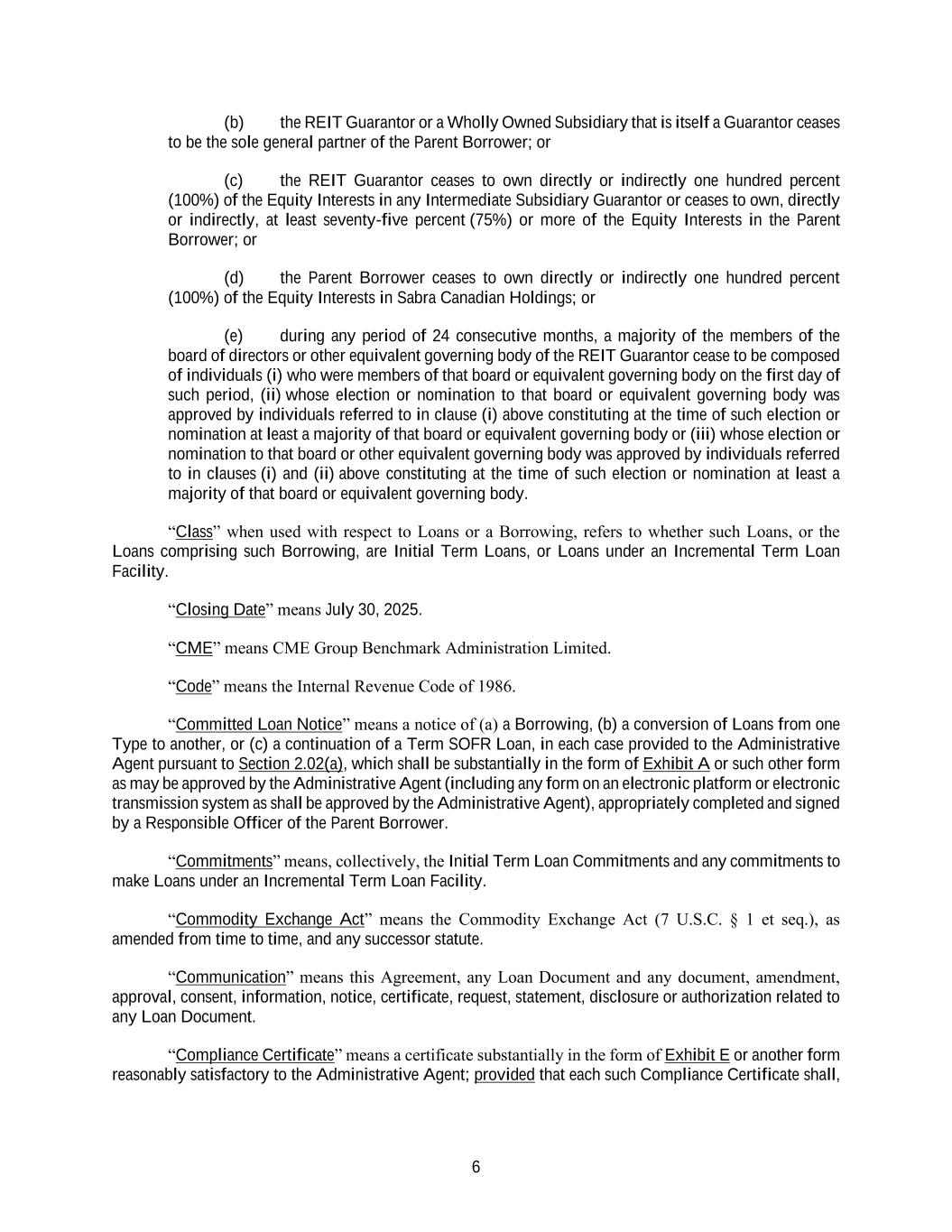 6 (b) the REIT Guarantor or a Wholly Owned Subsidiary that is itself a Guarantor ceases to be the sole general partner of the Parent Borrower; or (c) the REIT Guarantor ceases to own directly or indirectly one hundred percent (100%) of the Equity Interests in any Intermediate Subsidiary Guarantor or ceases to own, directly or indirectly, at least seventy-five percent (75%) or more of the Equity Interests in the Parent Borrower; or (d) the Parent Borrower ceases to own directly or indirectly one hundred percent (100%) of the Equity Interests in Sabra Canadian Holdings; or (e) during any period of 24 consecutive months, a majority of the members of the board of directors or other equivalent governing body of the REIT Guarantor cease to be composed of individuals (i) who were members of that board or equivalent governing body on the first day of such period, (ii) whose election or nomination to that board or equivalent governing body was approved by individuals referred to in clause (i) above constituting at the time of such election or nomination at least a majority of that board or equivalent governing body or (iii) whose election or nomination to that board or other equivalent governing body was approved by individuals referred to in clauses (i) and (ii) above constituting at the time of such election or nomination at least a majority of that board or equivalent governing body. “Class” when used with respect to Loans or a Borrowing, refers to whether such Loans, or the Loans comprising such Borrowing, are Initial Term Loans, or Loans under an Incremental Term Loan Facility. “Closing Date” means July 30, 2025. “CME” means CME Group Benchmark Administration Limited. “Code” means the Internal Revenue Code of 1986. “Committed Loan Notice” means a notice of (a) a Borrowing, (b) a conversion of Loans from one Type to another, or (c) a continuation of a Term SOFR Loan, in each case provided to the Administrative Agent pursuant to Section 2.02(a), which shall be substantially in the form of Exhibit A or such other form as may be approved by the Administrative Agent (including any form on an electronic platform or electronic transmission system as shall be approved by the Administrative Agent), appropriately completed and signed by a Responsible Officer of the Parent Borrower. “Commitments” means, collectively, the Initial Term Loan Commitments and any commitments to make Loans under an Incremental Term Loan Facility. “Commodity Exchange Act” means the Commodity Exchange Act (7 U.S.C. § 1 et seq.), as amended from time to time, and any successor statute. “Communication” means this Agreement, any Loan Document and any document, amendment, approval, consent, information, notice, certificate, request, statement, disclosure or authorization related to any Loan Document. “Compliance Certificate” means a certificate substantially in the form of Exhibit E or another form reasonably satisfactory to the Administrative Agent; provided that each such Compliance Certificate shall,