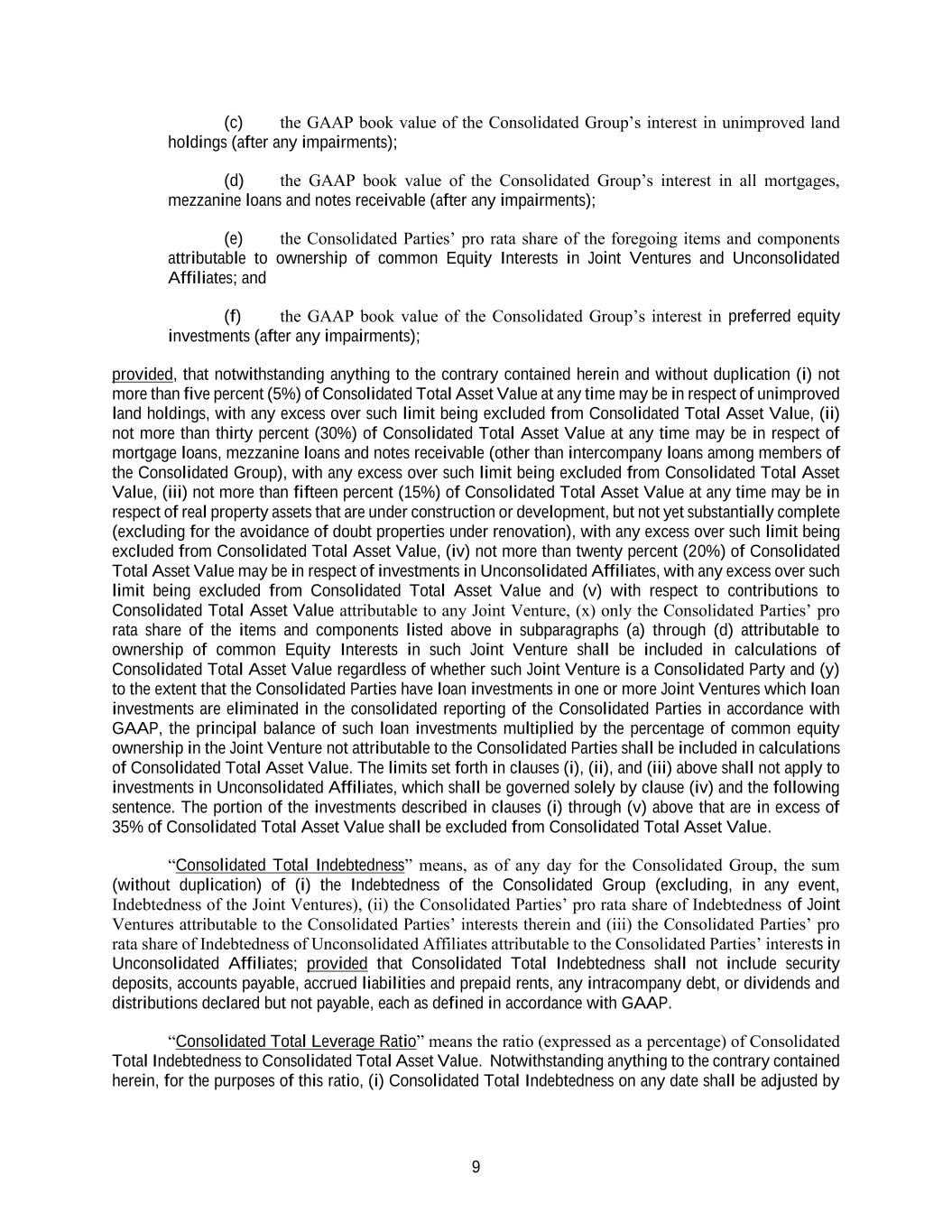 9 (c) the GAAP book value of the Consolidated Group’s interest in unimproved land holdings (after any impairments); (d) the GAAP book value of the Consolidated Group’s interest in all mortgages, mezzanine loans and notes receivable (after any impairments); (e) the Consolidated Parties’ pro rata share of the foregoing items and components attributable to ownership of common Equity Interests in Joint Ventures and Unconsolidated Affiliates; and (f) the GAAP book value of the Consolidated Group’s interest in preferred equity investments (after any impairments); provided, that notwithstanding anything to the contrary contained herein and without duplication (i) not more than five percent (5%) of Consolidated Total Asset Value at any time may be in respect of unimproved land holdings, with any excess over such limit being excluded from Consolidated Total Asset Value, (ii) not more than thirty percent (30%) of Consolidated Total Asset Value at any time may be in respect of mortgage loans, mezzanine loans and notes receivable (other than intercompany loans among members of the Consolidated Group), with any excess over such limit being excluded from Consolidated Total Asset Value, (iii) not more than fifteen percent (15%) of Consolidated Total Asset Value at any time may be in respect of real property assets that are under construction or development, but not yet substantially complete (excluding for the avoidance of doubt properties under renovation), with any excess over such limit being excluded from Consolidated Total Asset Value, (iv) not more than twenty percent (20%) of Consolidated Total Asset Value may be in respect of investments in Unconsolidated Affiliates, with any excess over such limit being excluded from Consolidated Total Asset Value and (v) with respect to contributions to Consolidated Total Asset Value attributable to any Joint Venture, (x) only the Consolidated Parties’ pro rata share of the items and components listed above in subparagraphs (a) through (d) attributable to ownership of common Equity Interests in such Joint Venture shall be included in calculations of Consolidated Total Asset Value regardless of whether such Joint Venture is a Consolidated Party and (y) to the extent that the Consolidated Parties have loan investments in one or more Joint Ventures which loan investments are eliminated in the consolidated reporting of the Consolidated Parties in accordance with GAAP, the principal balance of such loan investments multiplied by the percentage of common equity ownership in the Joint Venture not attributable to the Consolidated Parties shall be included in calculations of Consolidated Total Asset Value. The limits set forth in clauses (i), (ii), and (iii) above shall not apply to investments in Unconsolidated Affiliates, which shall be governed solely by clause (iv) and the following sentence. The portion of the investments described in clauses (i) through (v) above that are in excess of 35% of Consolidated Total Asset Value shall be excluded from Consolidated Total Asset Value. “Consolidated Total Indebtedness” means, as of any day for the Consolidated Group, the sum (without duplication) of (i) the Indebtedness of the Consolidated Group (excluding, in any event, Indebtedness of the Joint Ventures), (ii) the Consolidated Parties’ pro rata share of Indebtedness of Joint Ventures attributable to the Consolidated Parties’ interests therein and (iii) the Consolidated Parties’ pro rata share of Indebtedness of Unconsolidated Affiliates attributable to the Consolidated Parties’ interests in Unconsolidated Affiliates; provided that Consolidated Total Indebtedness shall not include security deposits, accounts payable, accrued liabilities and prepaid rents, any intracompany debt, or dividends and distributions declared but not payable, each as defined in accordance with GAAP. “Consolidated Total Leverage Ratio” means the ratio (expressed as a percentage) of Consolidated Total Indebtedness to Consolidated Total Asset Value. Notwithstanding anything to the contrary contained herein, for the purposes of this ratio, (i) Consolidated Total Indebtedness on any date shall be adjusted by